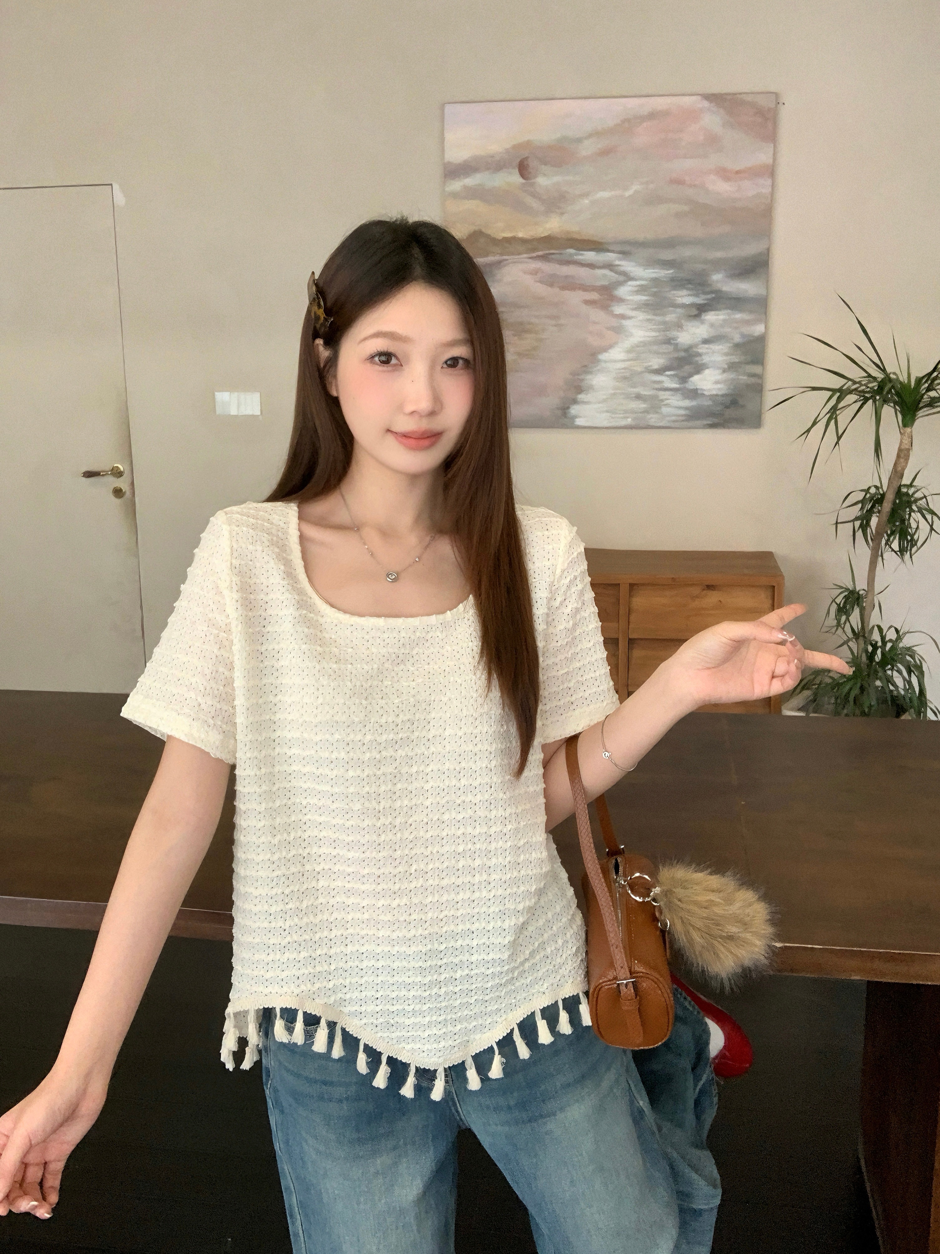 BY16129# 夏季新款胖mm大码女法式镂空流苏长袖T恤不规则圆领上衣 服裝批發女裝批發服飾貨源