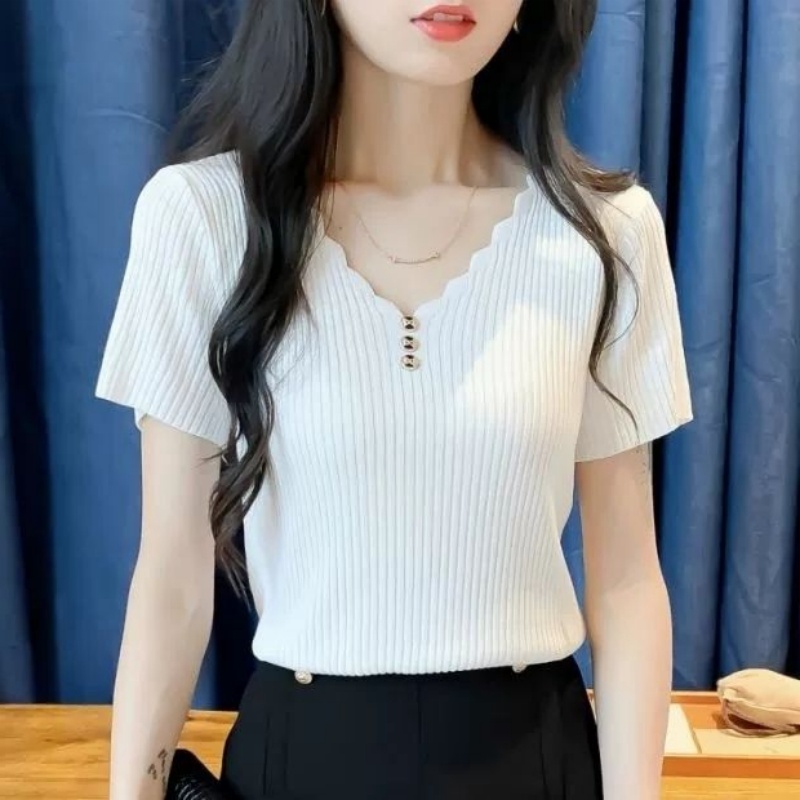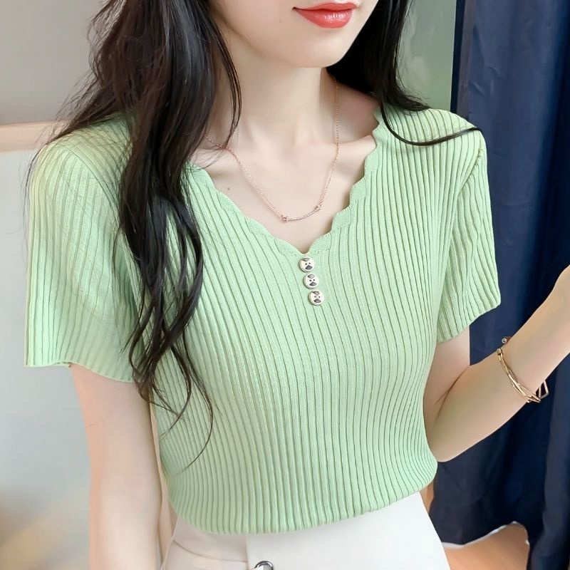 BY16282# 冰丝短袖t恤女装夏季新款修身短款韩版纽扣V领针织打底衫薄款上衣 服裝批發女裝批發服飾貨源