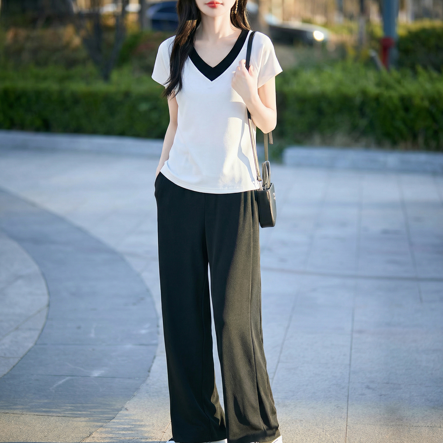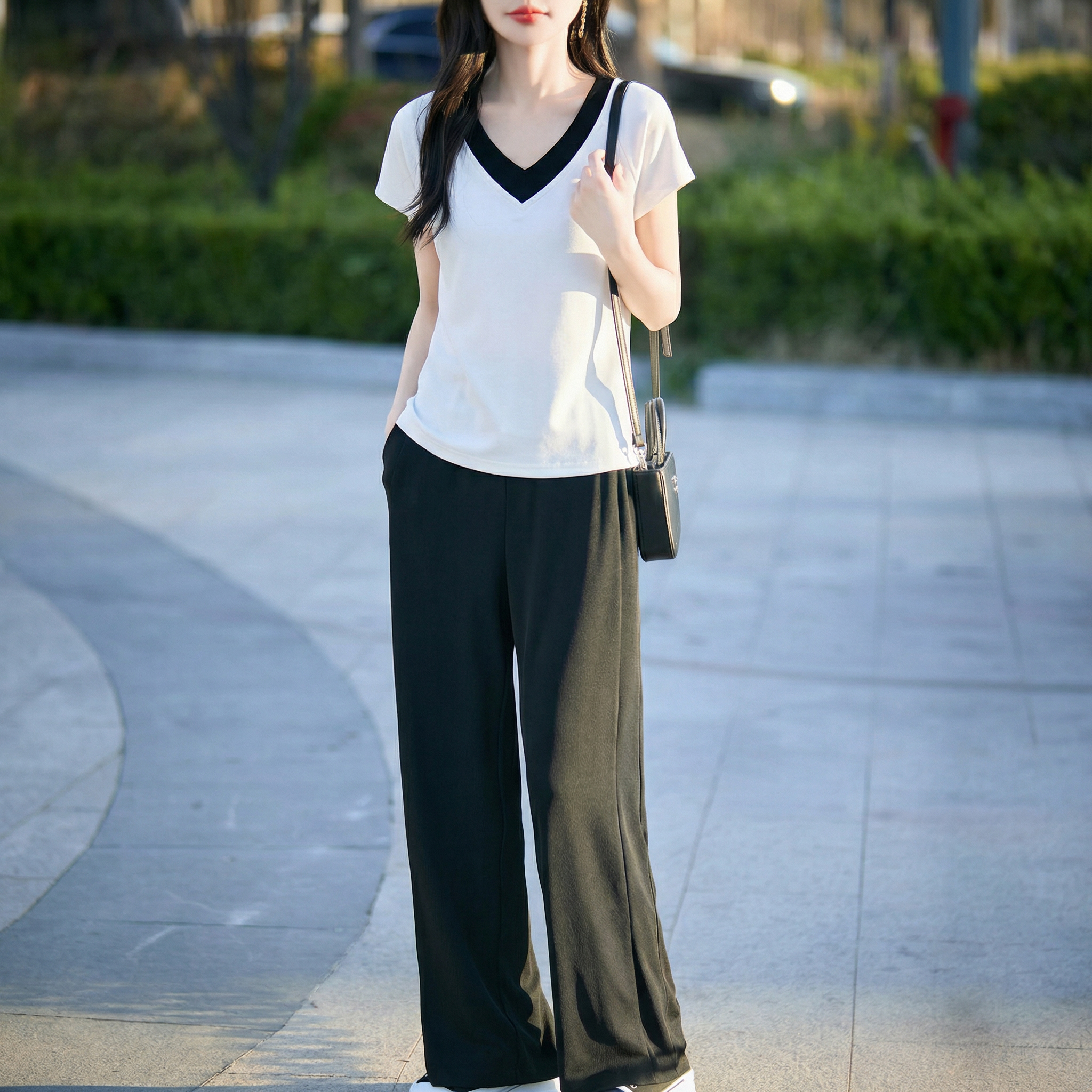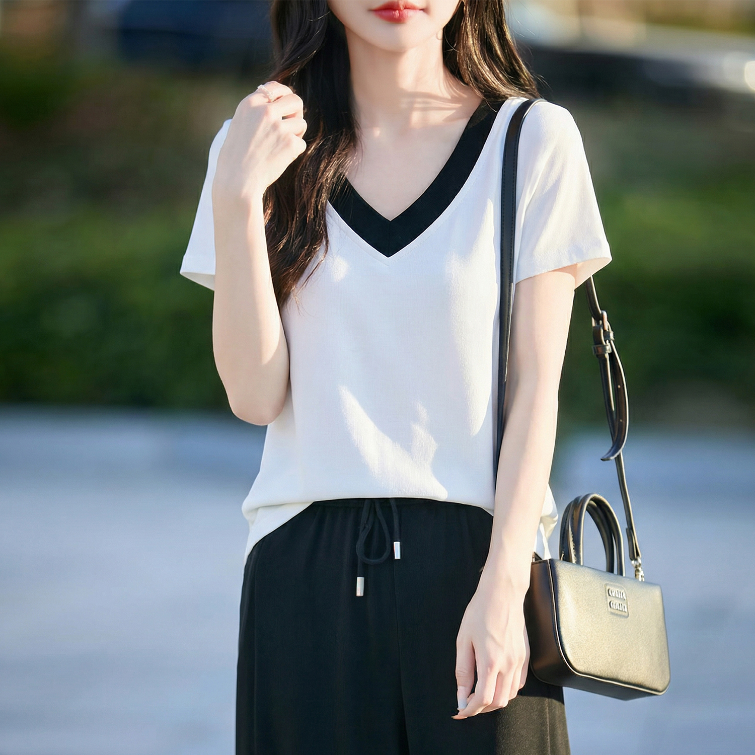 假两件撞色V领短袖夏季新款气质百搭时尚显瘦套装女