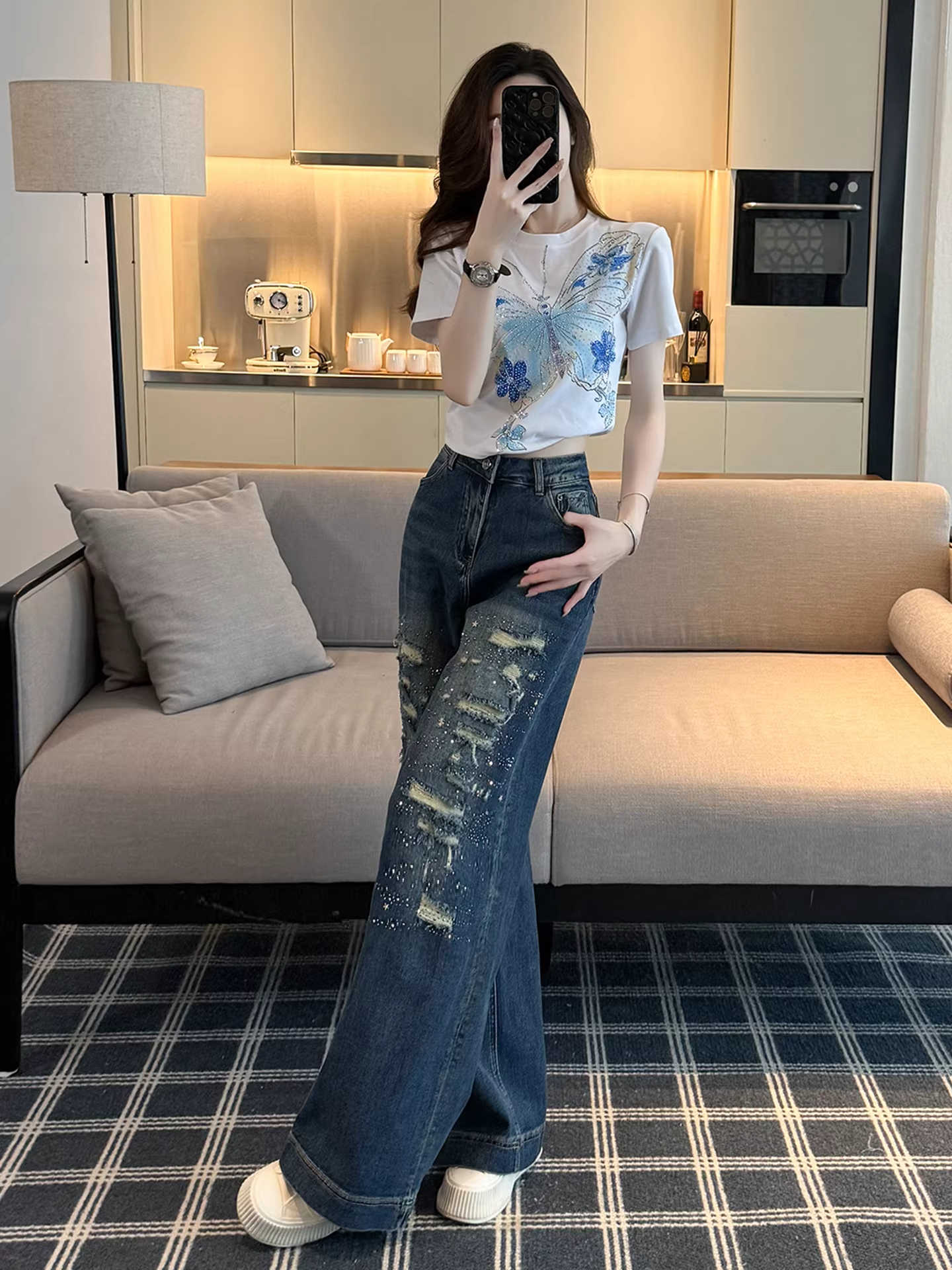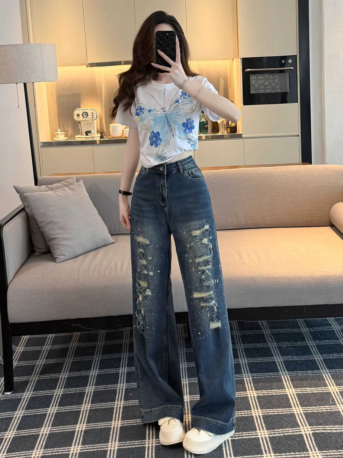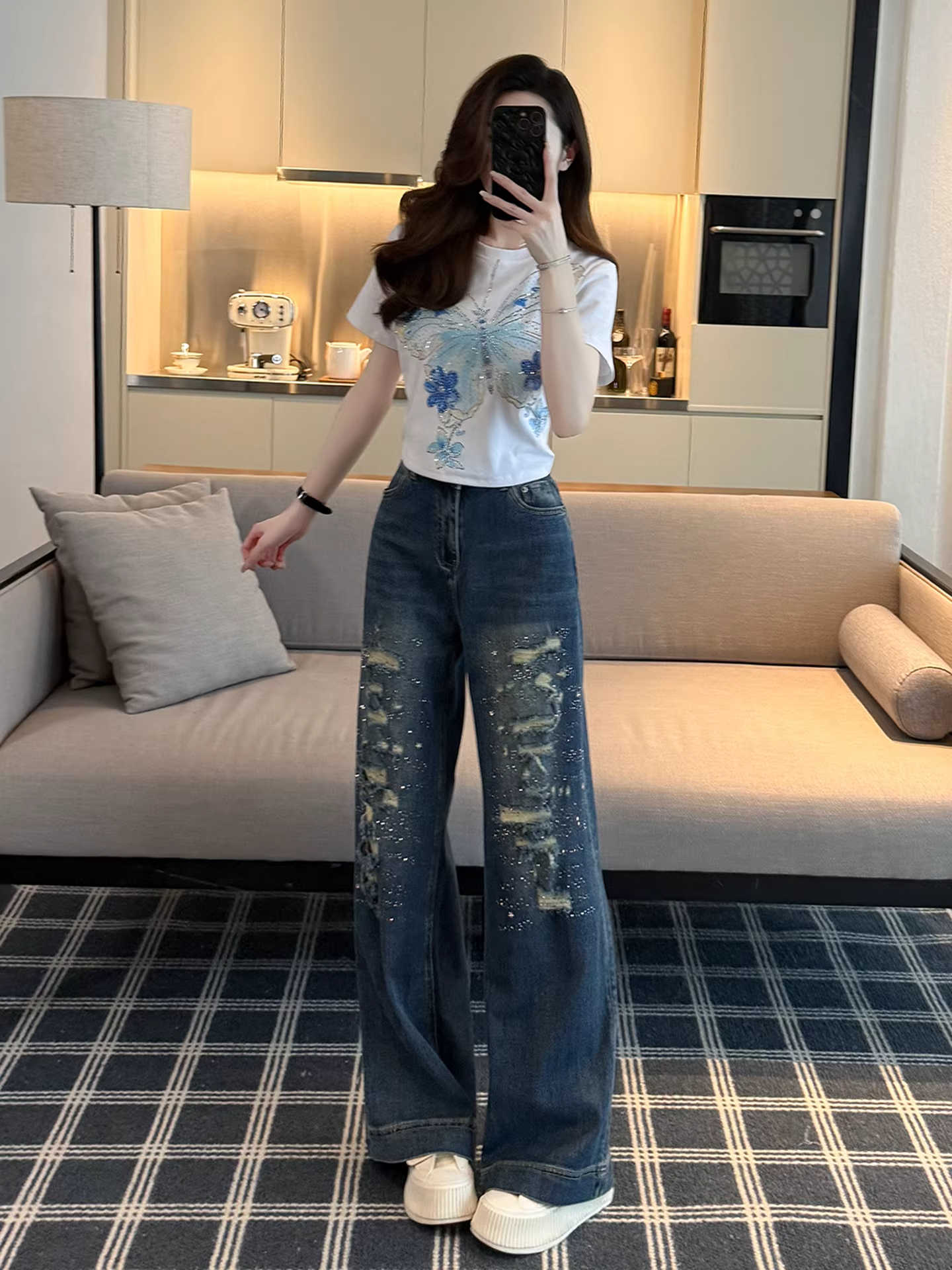 BY16827# 复古蓝破洞烫钻牛仔裤女夏季新款宽松高腰显瘦垂感直筒喇叭裤