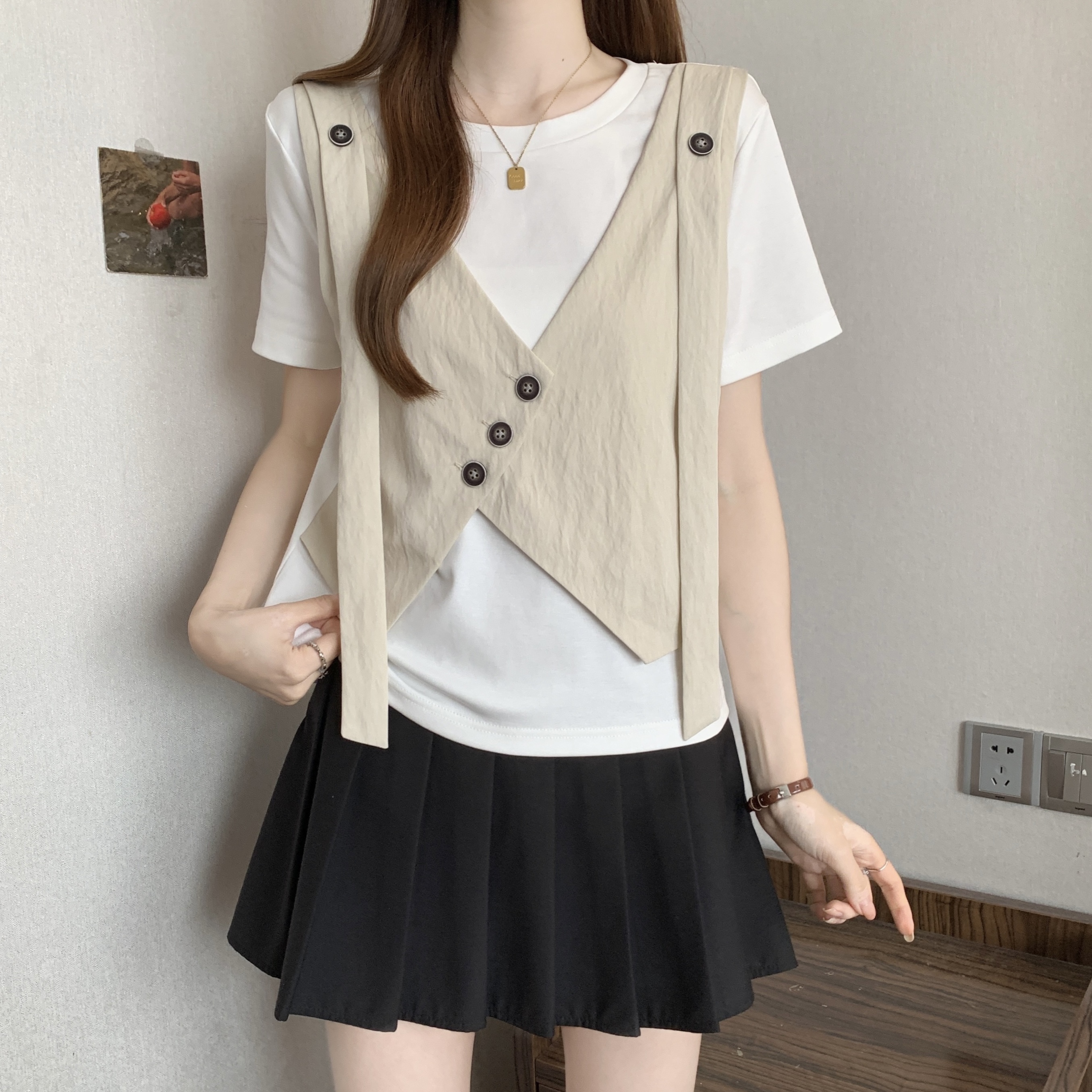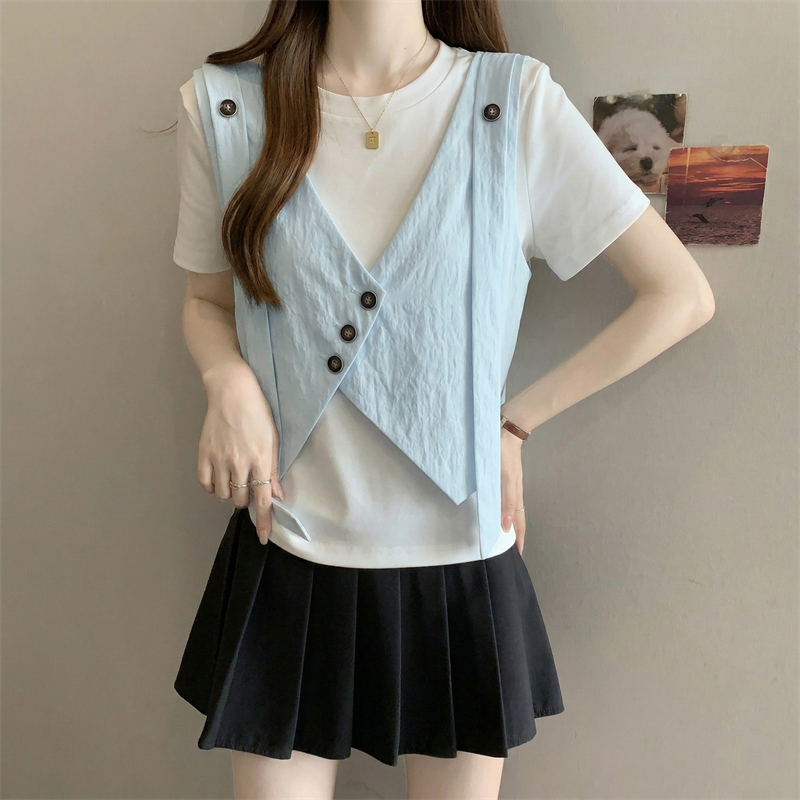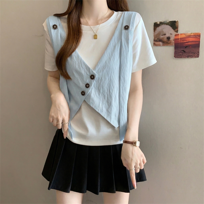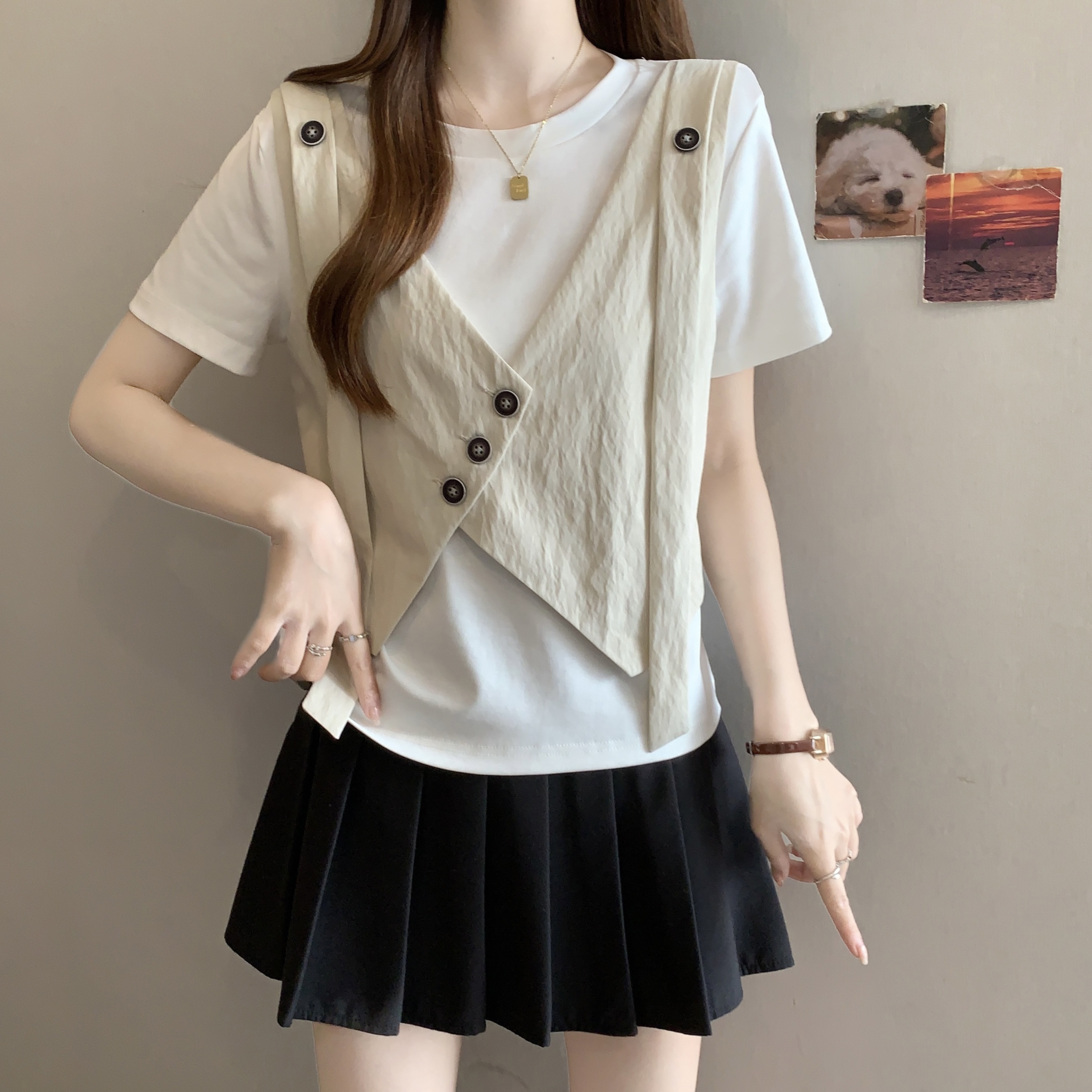 大码胖MM新款设计感假两件拼接正肩短袖T恤遮肚显瘦上衣