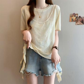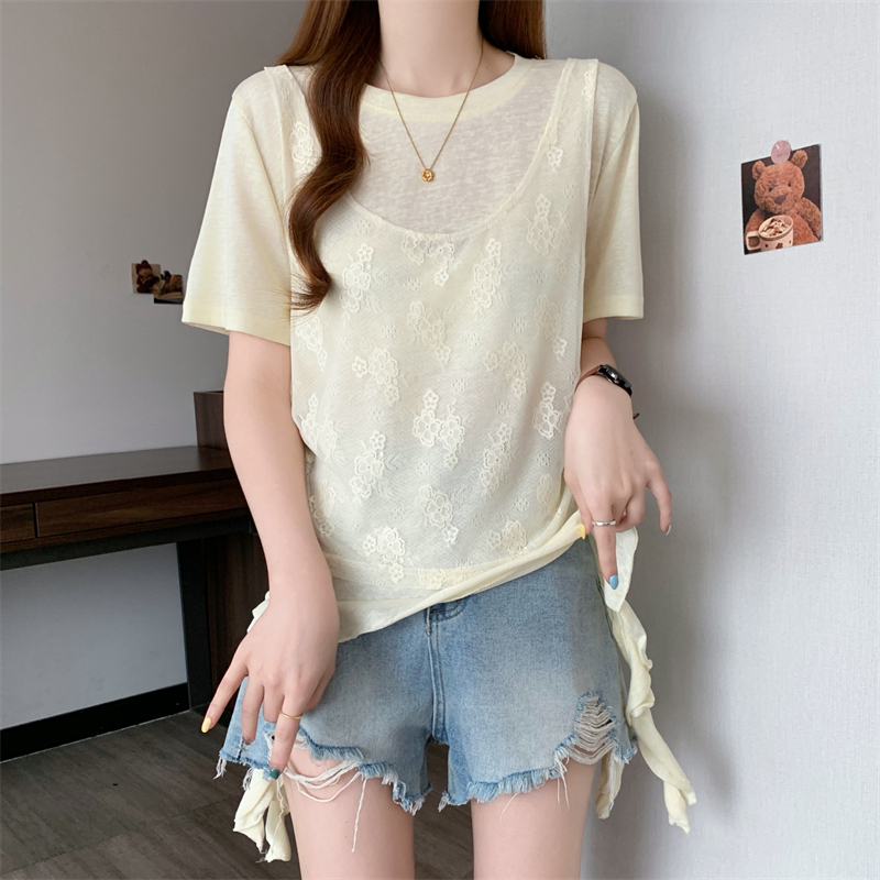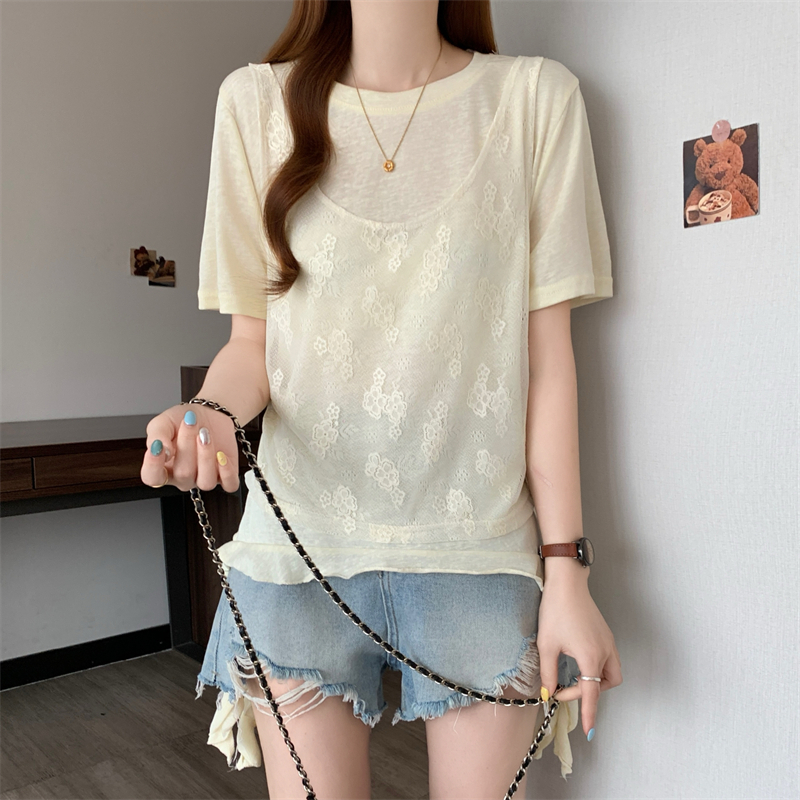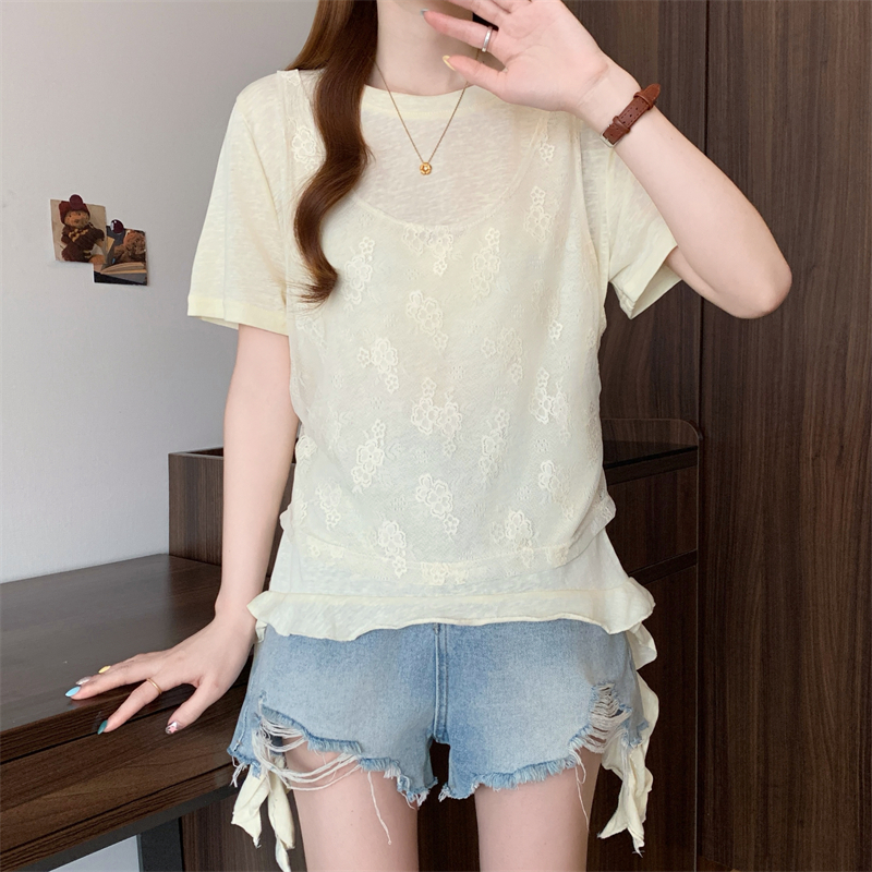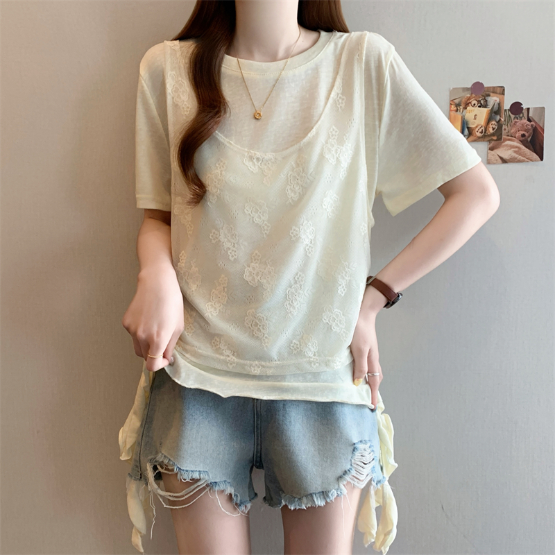大码胖MM新款设计感拼接短袖T恤女夏季韩系假两件上衣