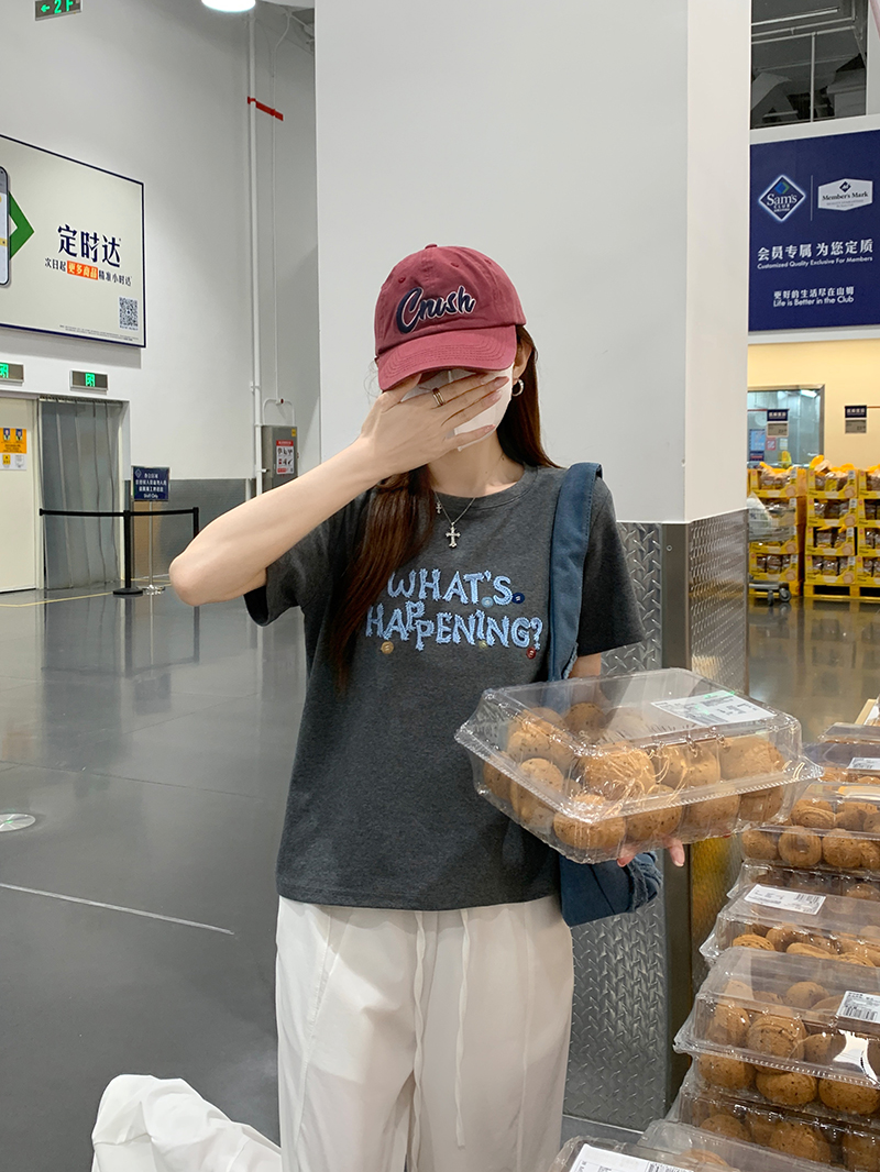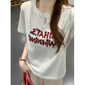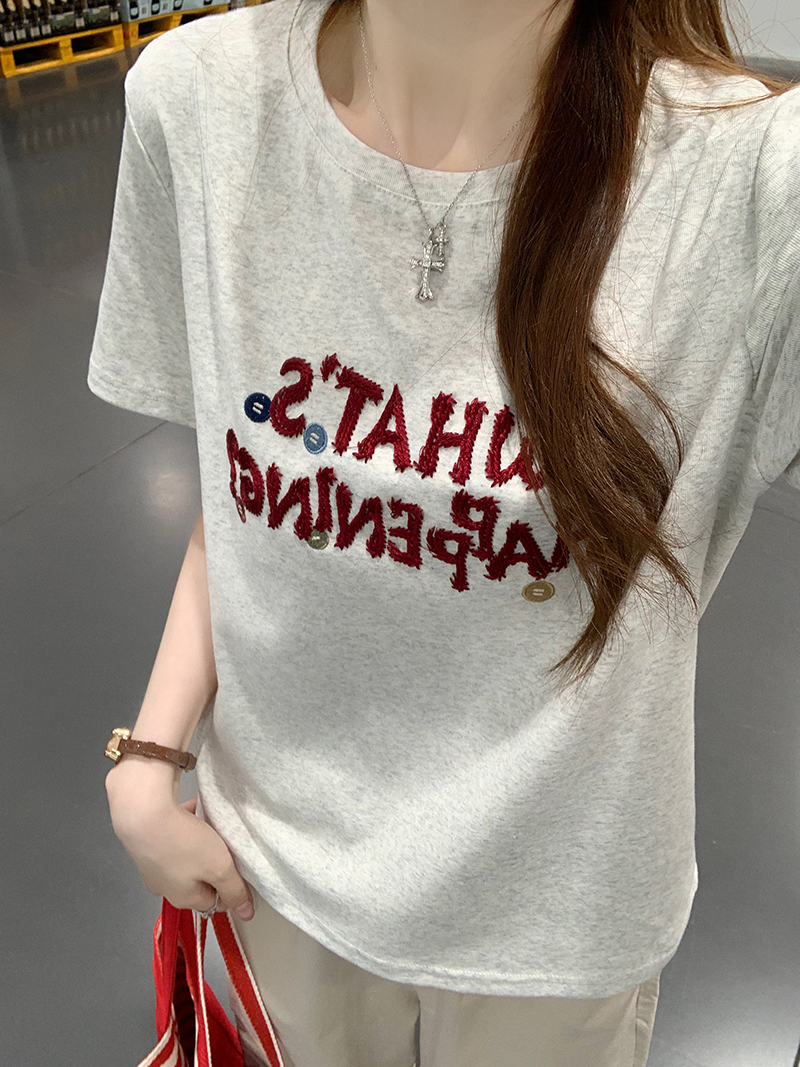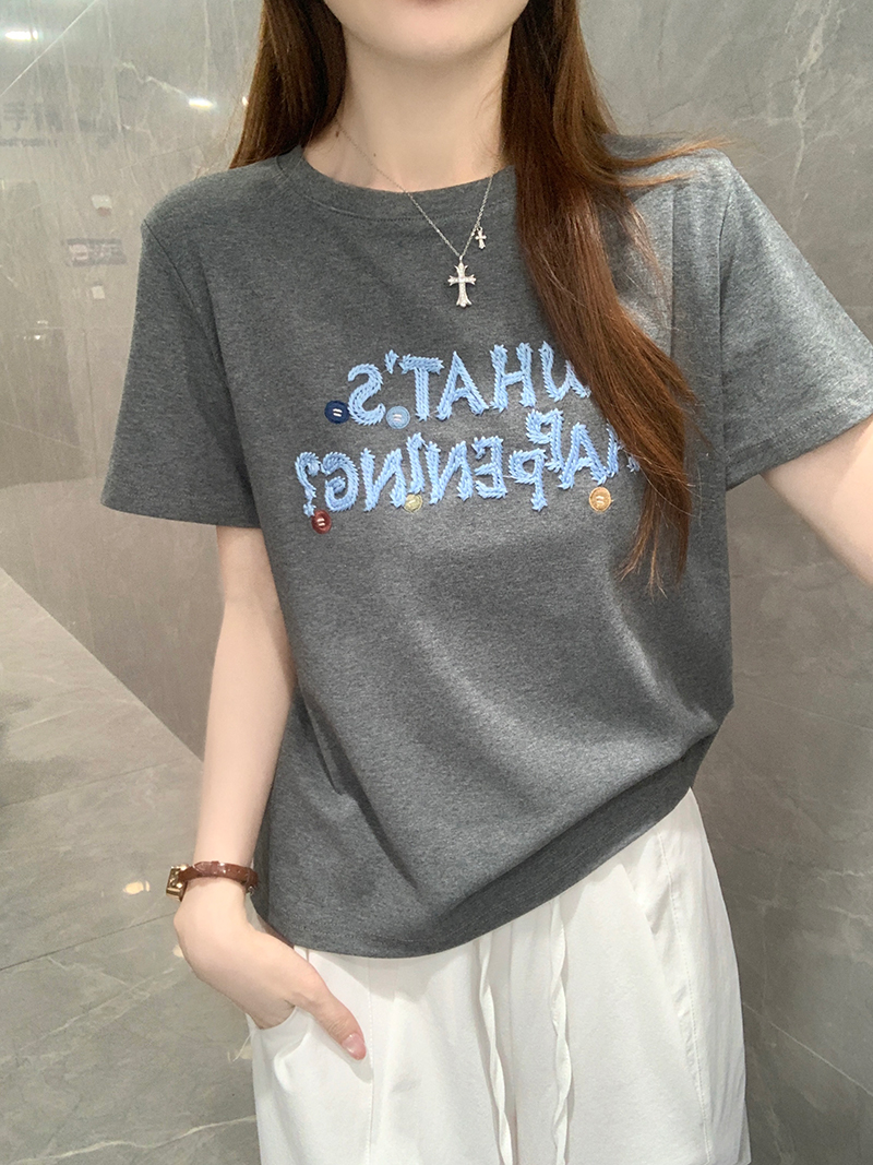 纯棉螺纹短袖t恤女装夏修身新款刺绣花圆领上衣