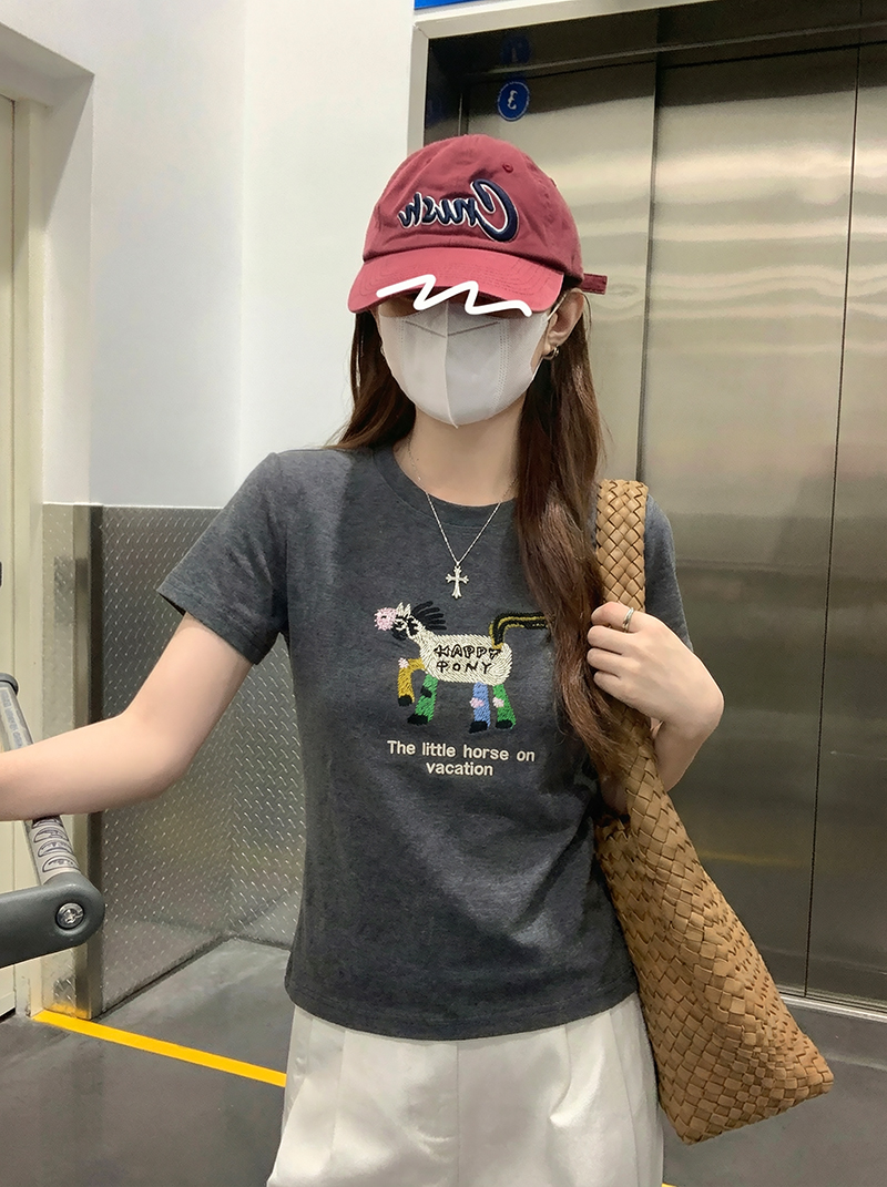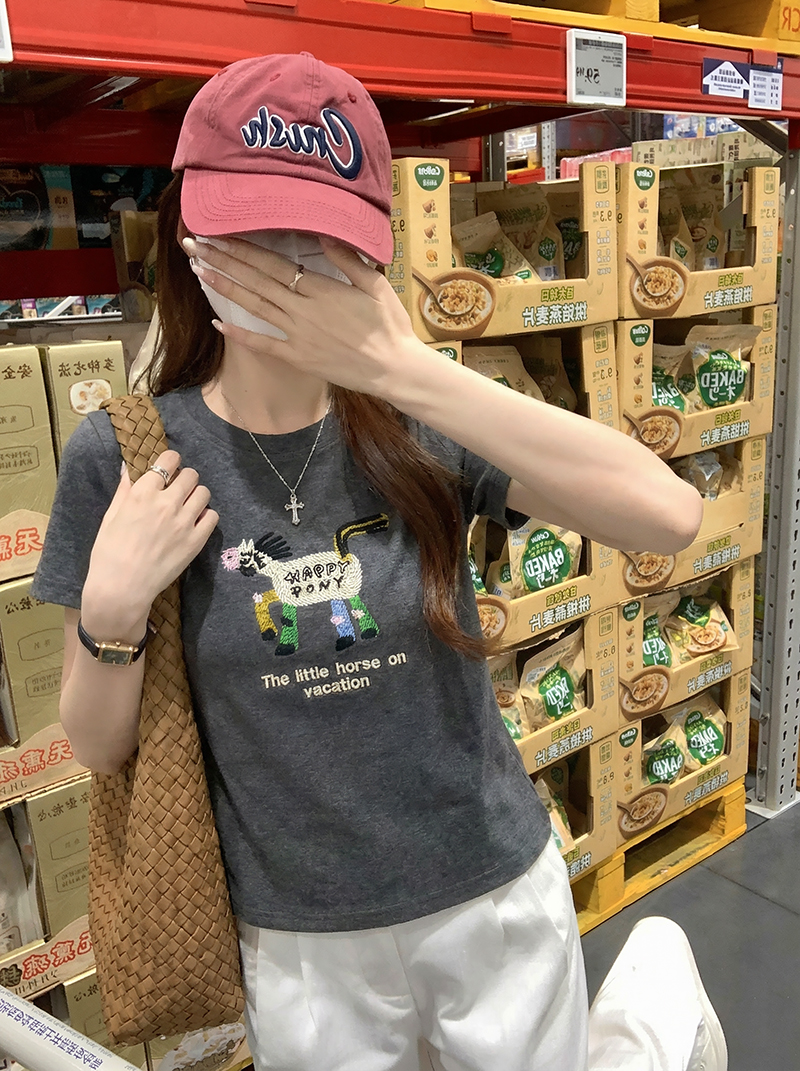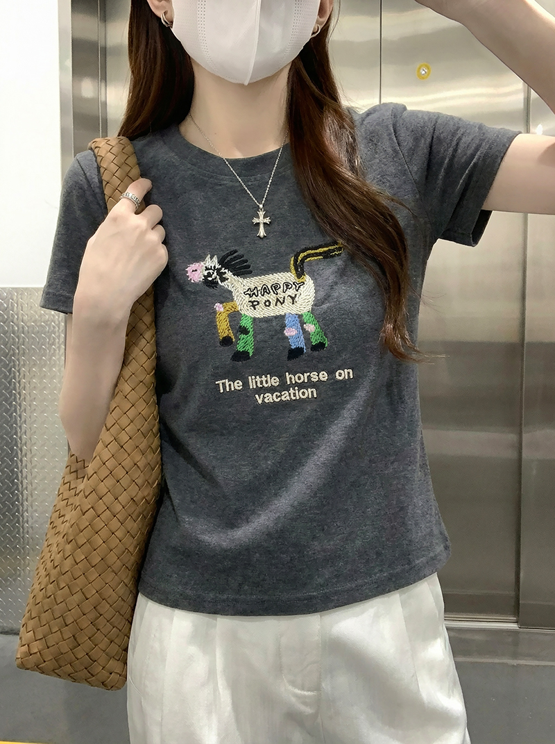 纯棉螺纹短袖t恤女夏新款韩系刺绣正肩圆领上衣