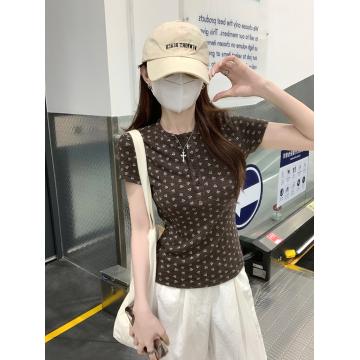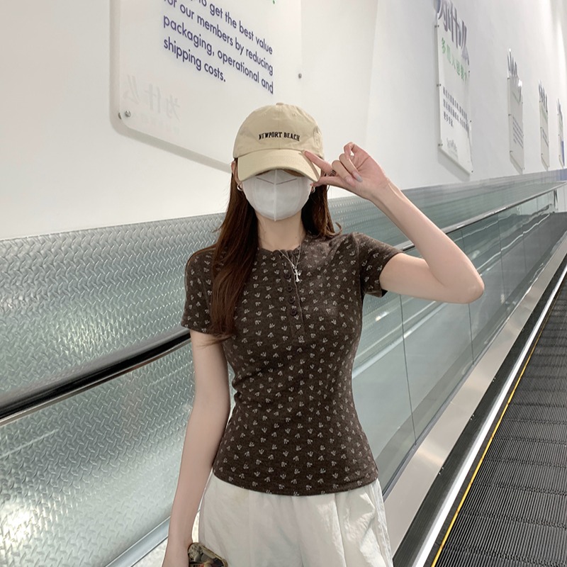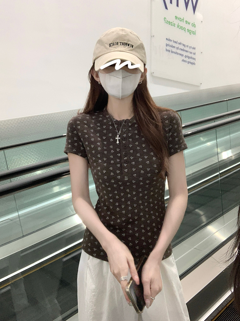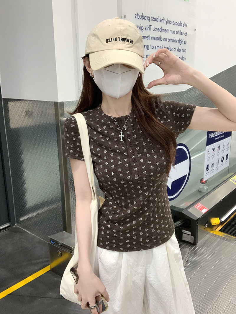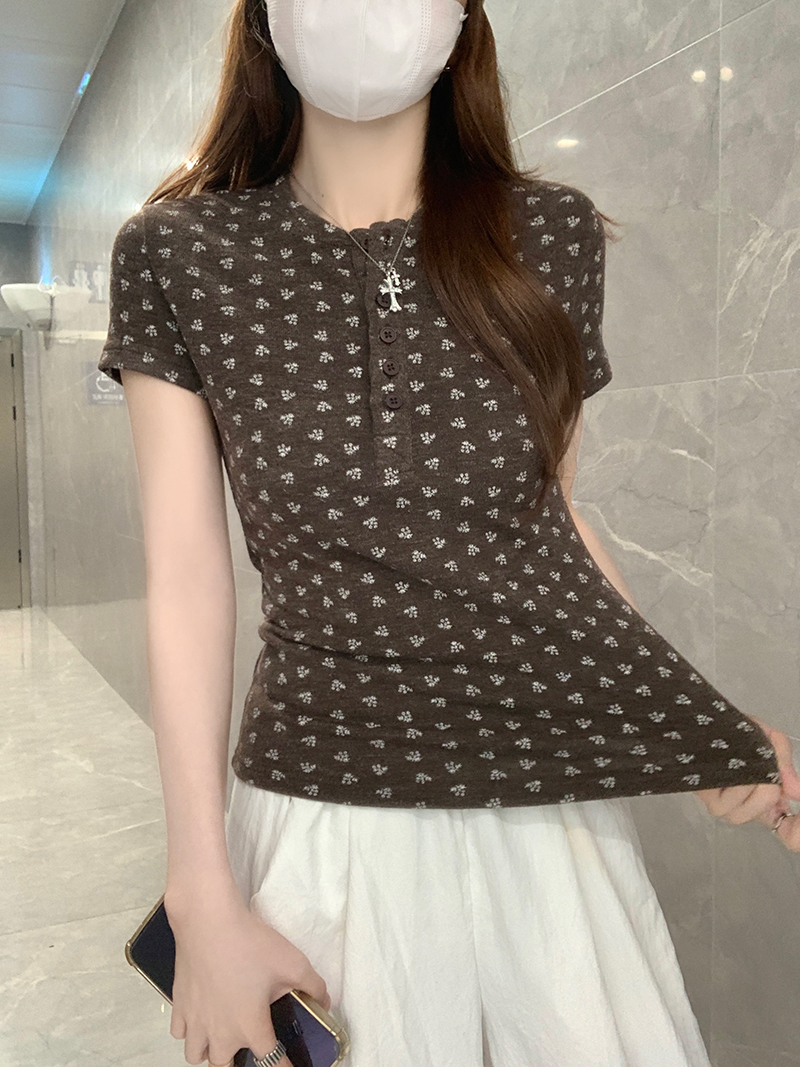 原版布料短袖t恤女装夏季新款韩系碎花亨利衫领上衣