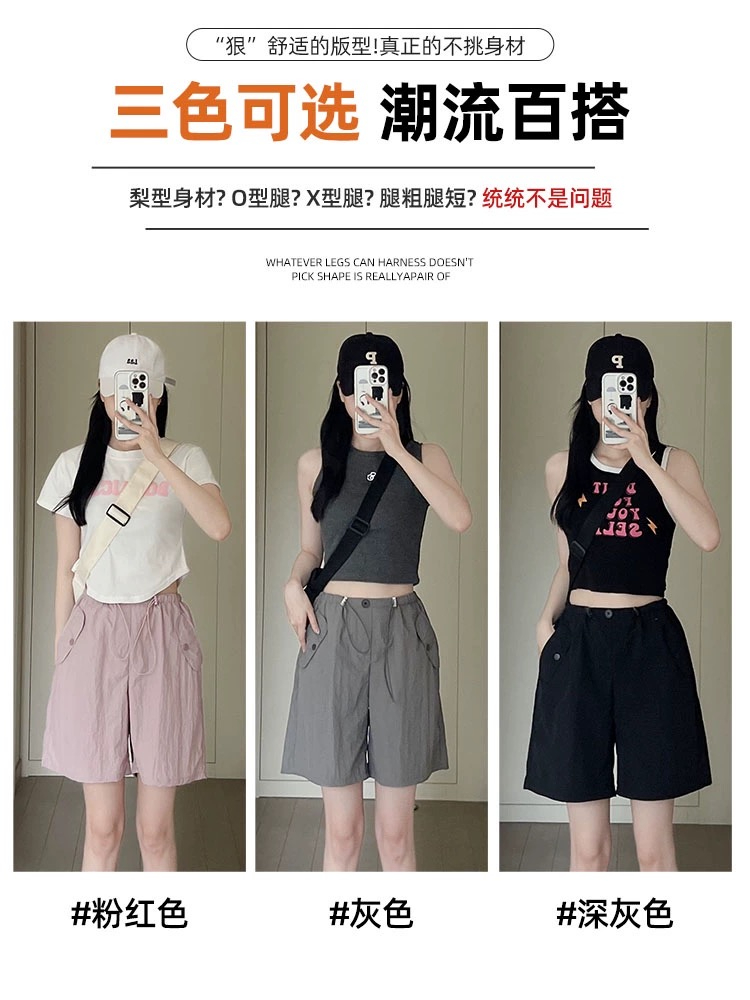 灰色工装短裤女夏季薄款高腰休闲阔腿设计感速干运动美式五分裤子