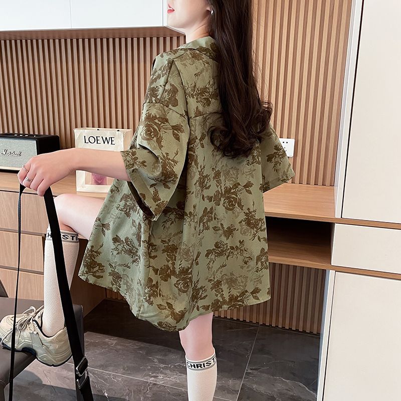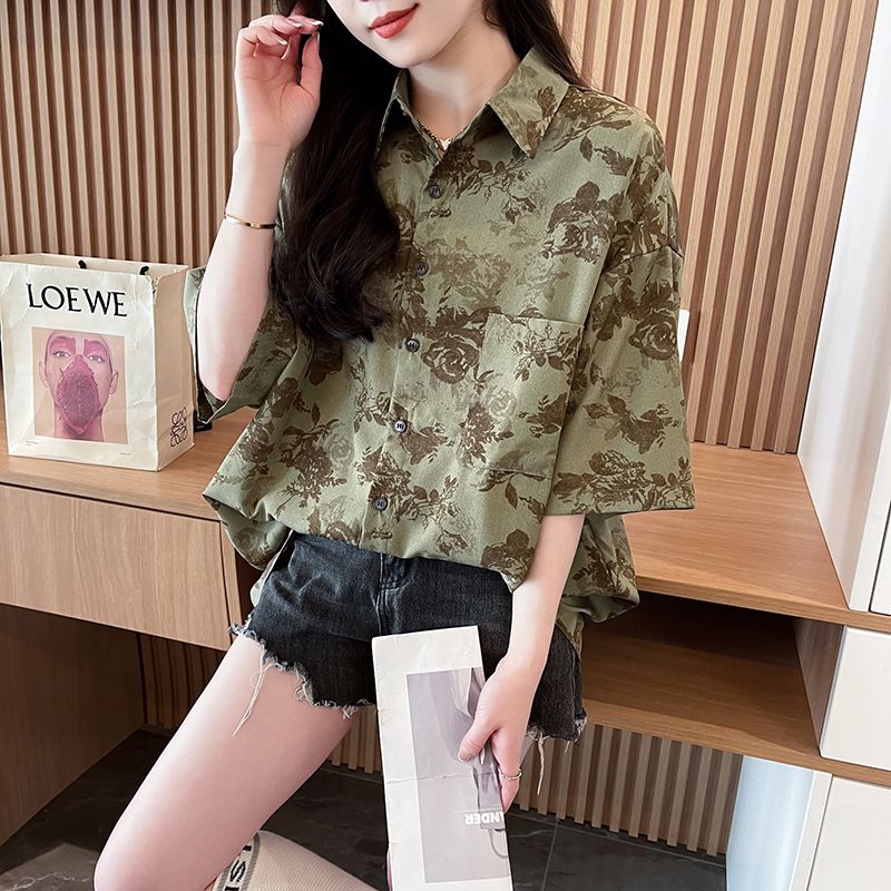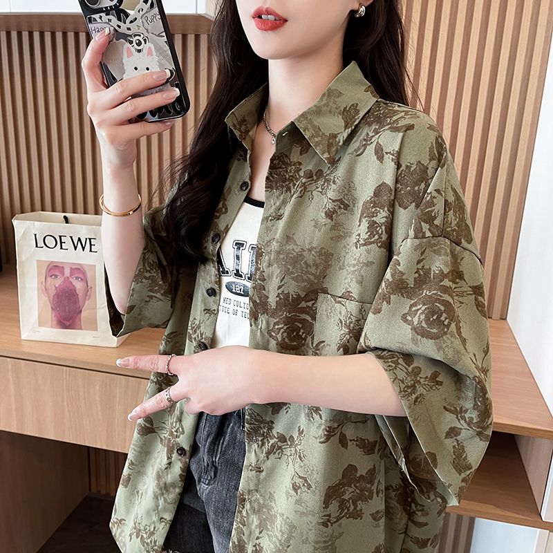短袖防晒衬衫夏季新款美式复古宽松港风设计感花上衣