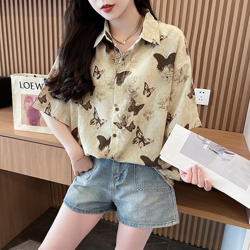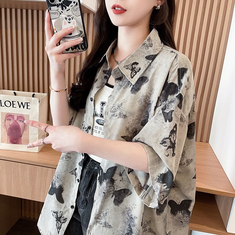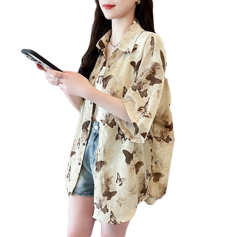 长袖防晒衬衫夏季新款蝴蝶印花小众复古风法式上衣女