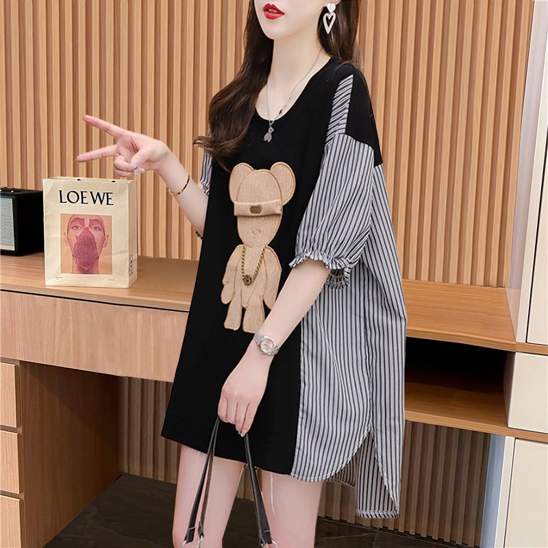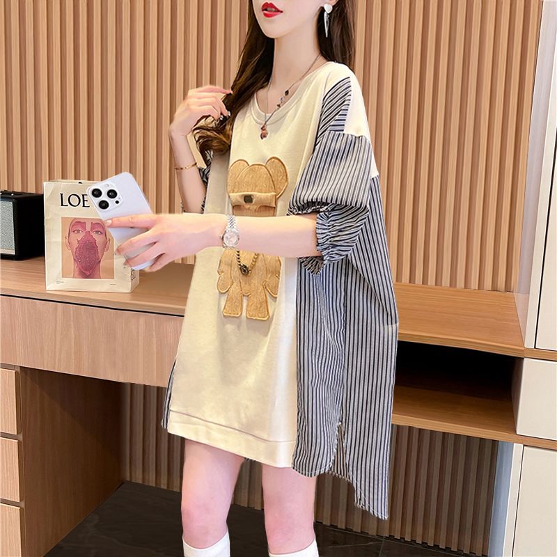 棉拉架夏季条纹设计拼接印花圆领短袖T恤女