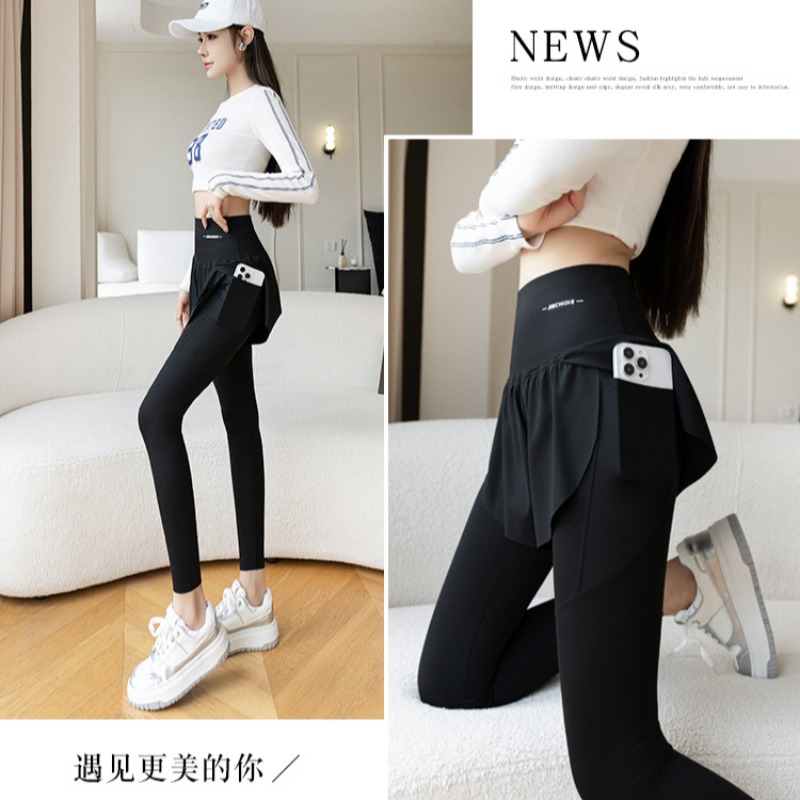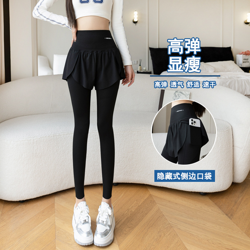 春新屁帘裤高弹假两件瑜伽裤九分薄高腰口袋鲨鱼裤运动裤