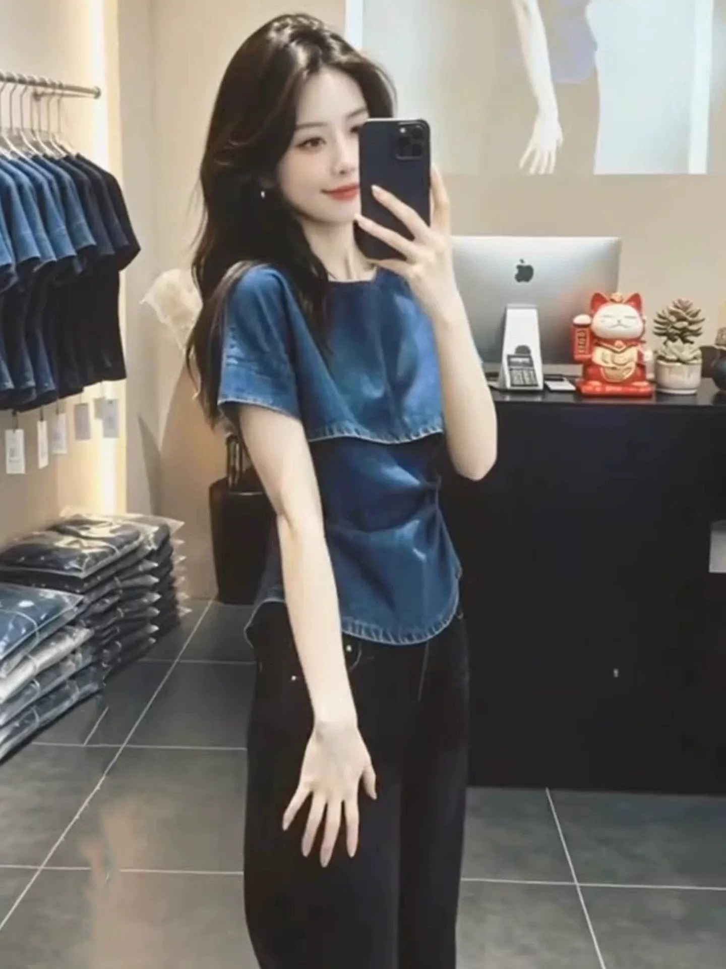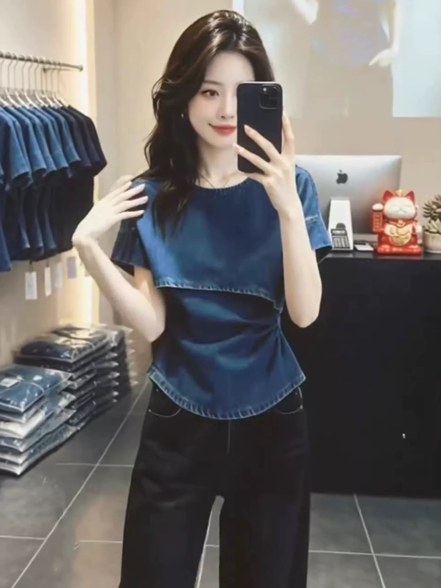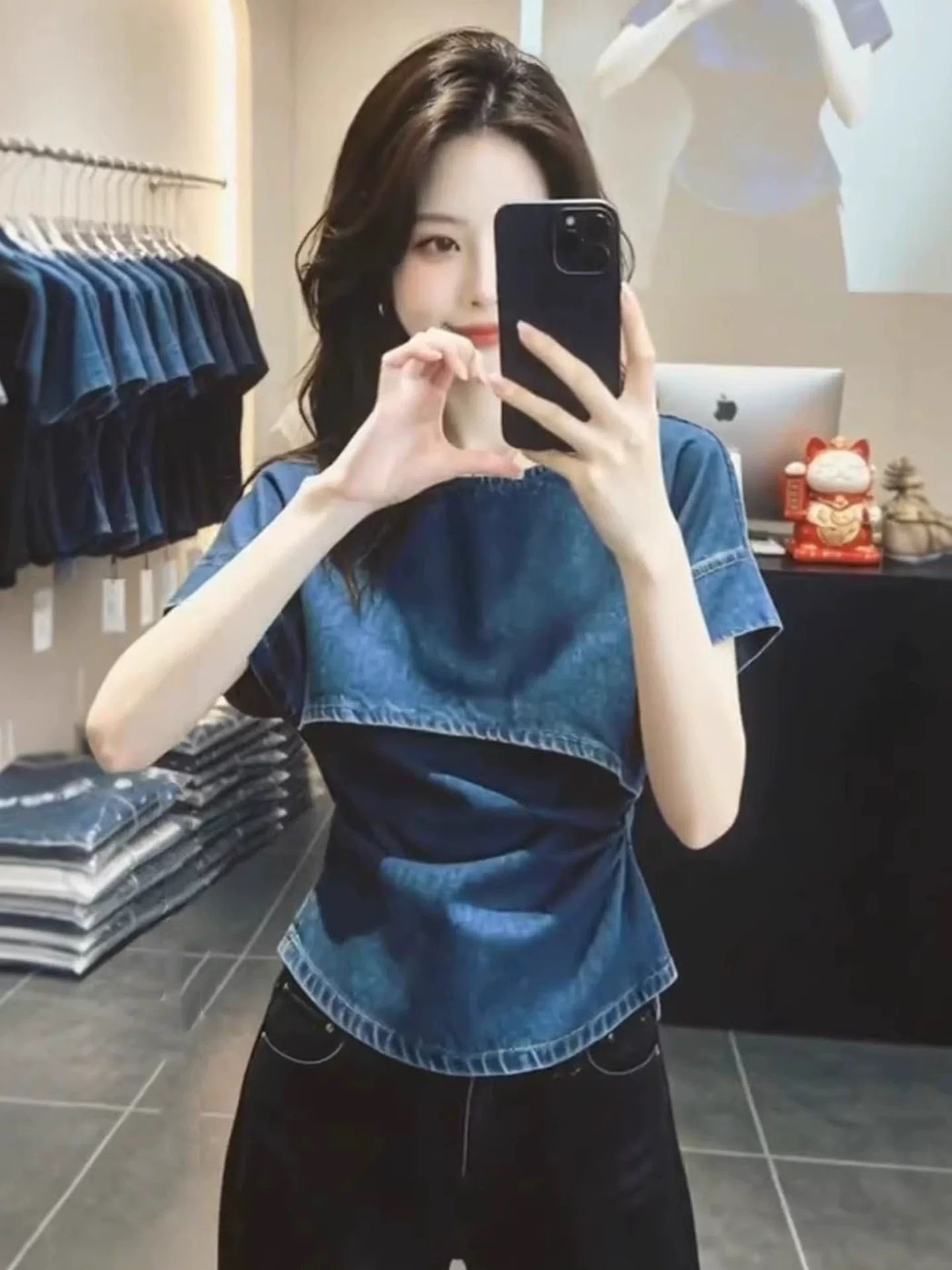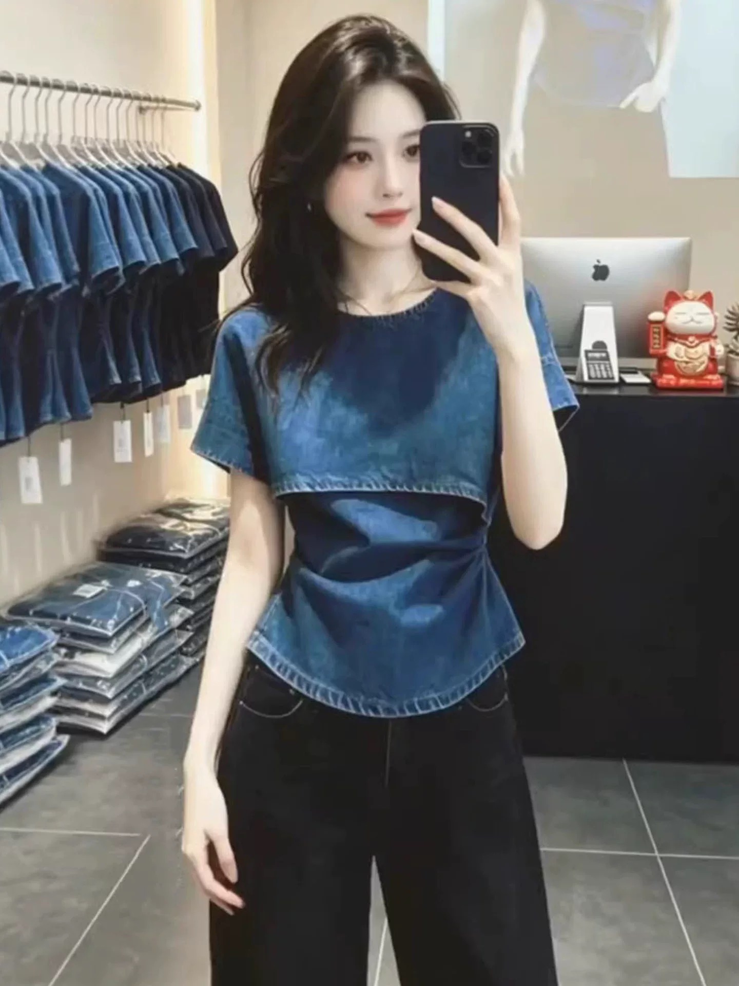 BY17023# 时尚潮流设计感斜肩牛仔上衣女夏季新款宽松小众蓝色短袖衬衫 服裝批發女裝批發服飾貨源