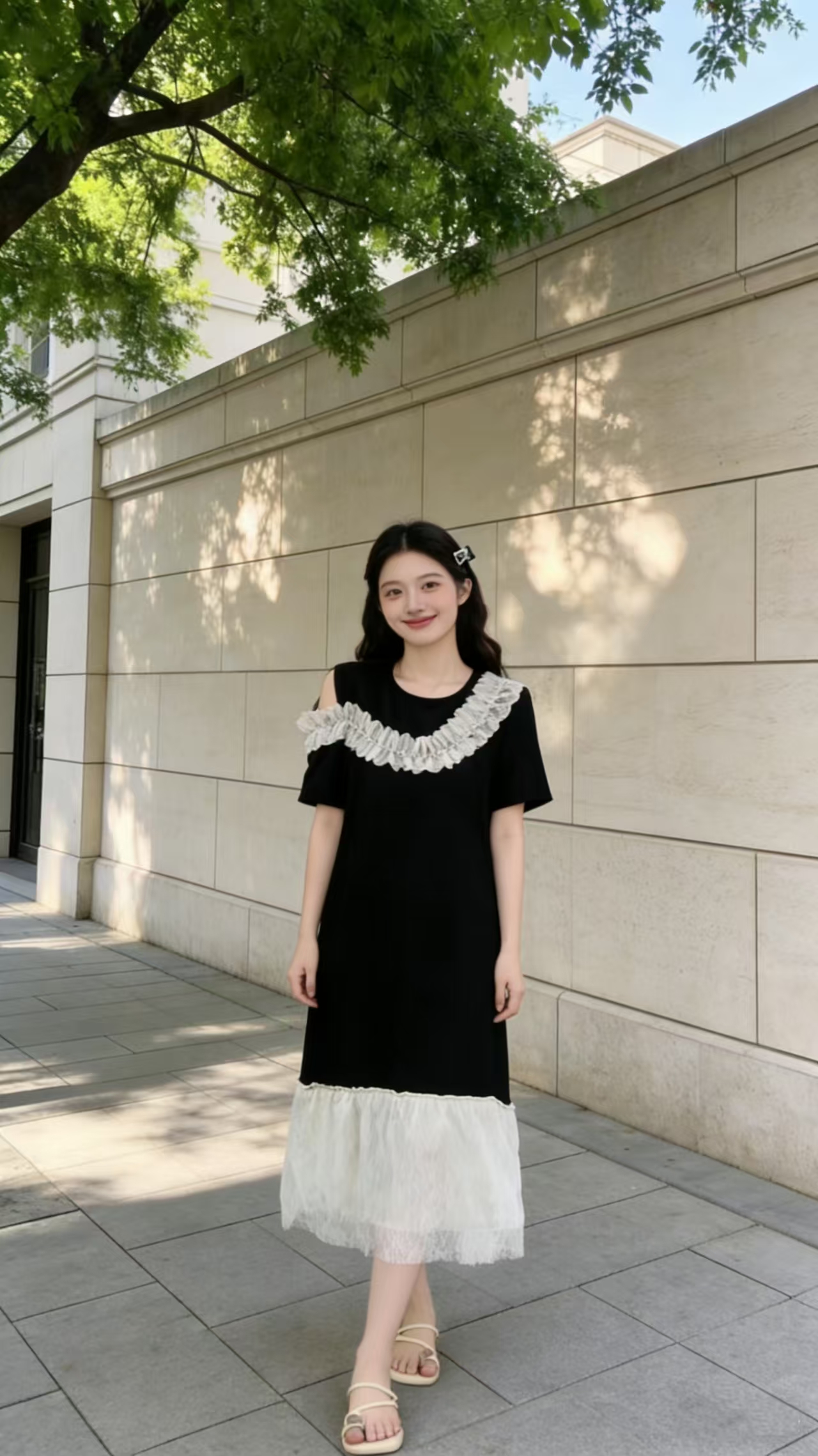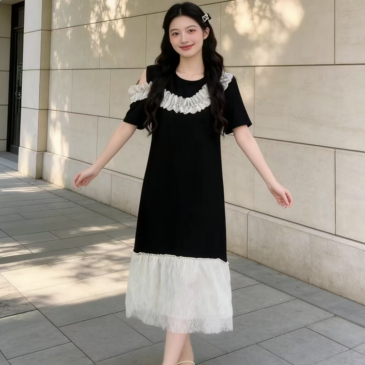 BY17195# 法式露肩荷叶领蕾丝拼接大码连衣裙小众流行显瘦黑色长裙