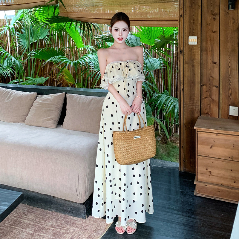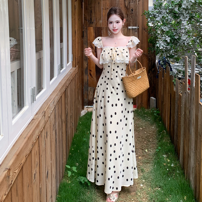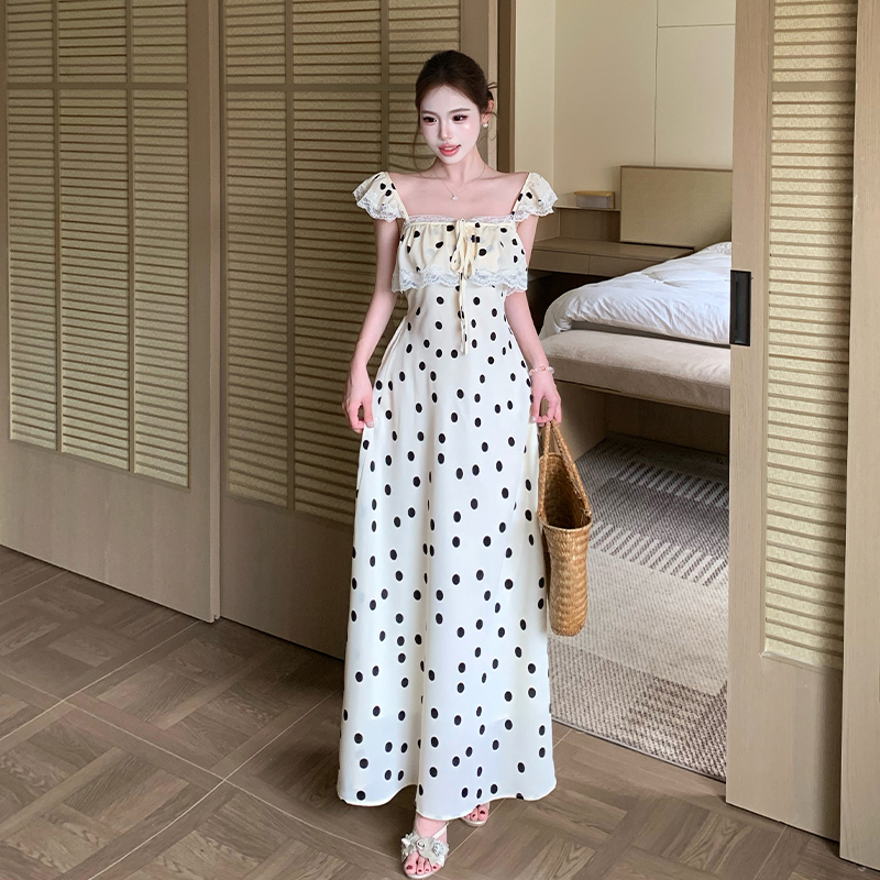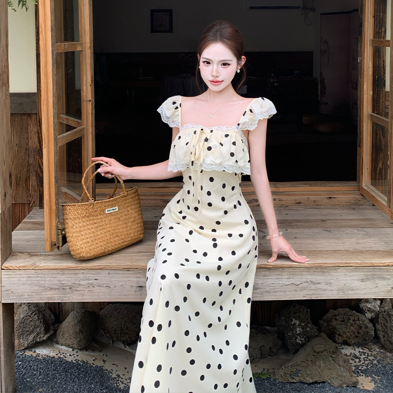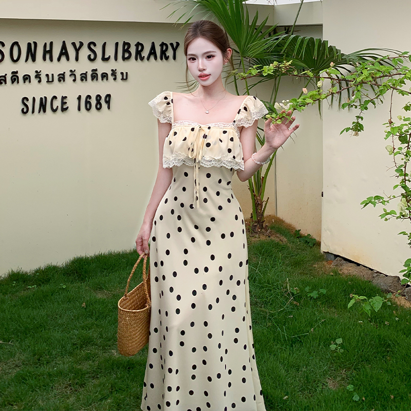 BY17225# 法式复古气质波点无袖吊带连衣裙女飞飞袖系带蕾丝拼接显瘦长裙夏