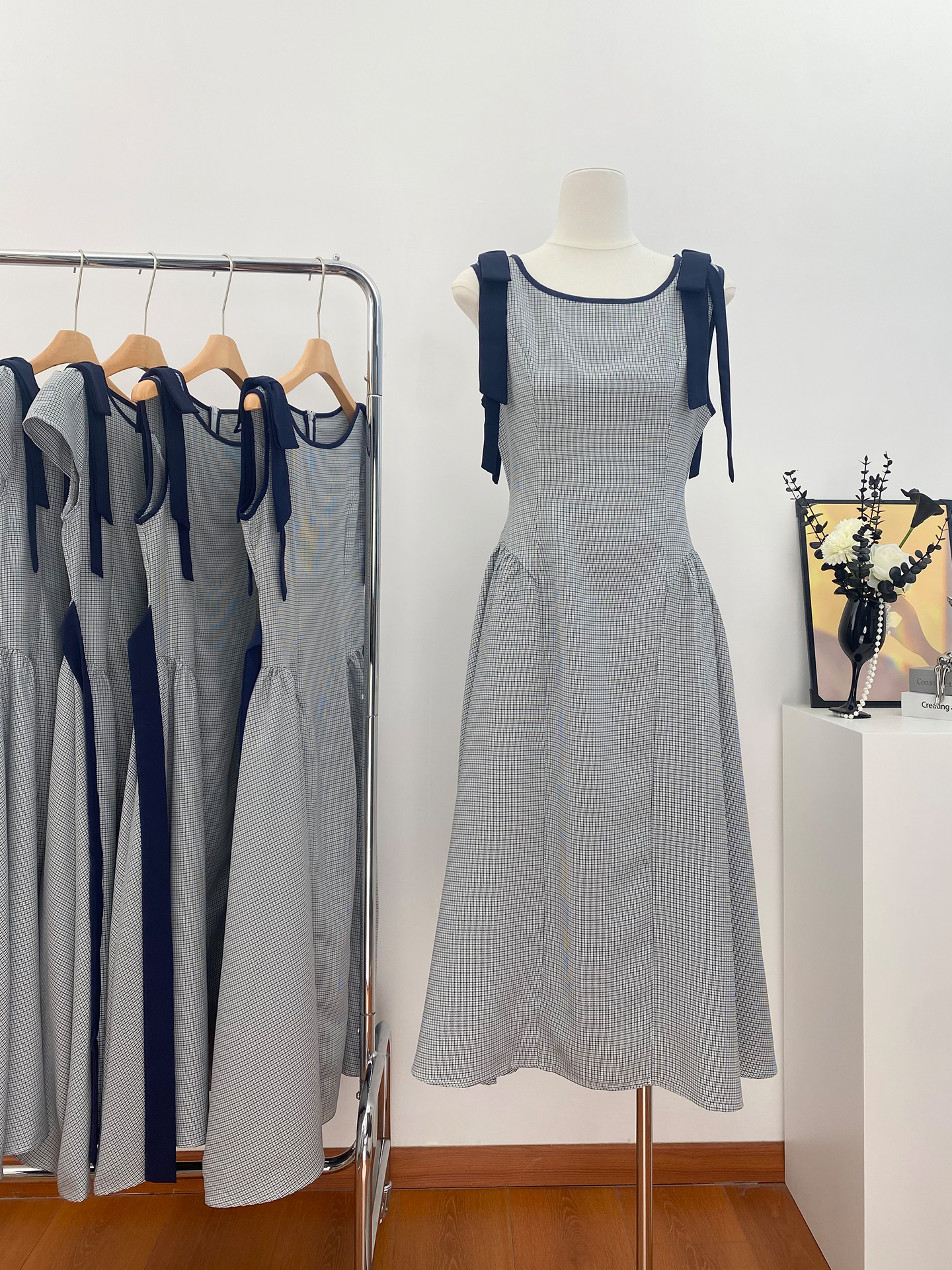 BY17287# 小八定制格影碟结蓝色巨好看的收腰气质高级感格子法式连衣裙
