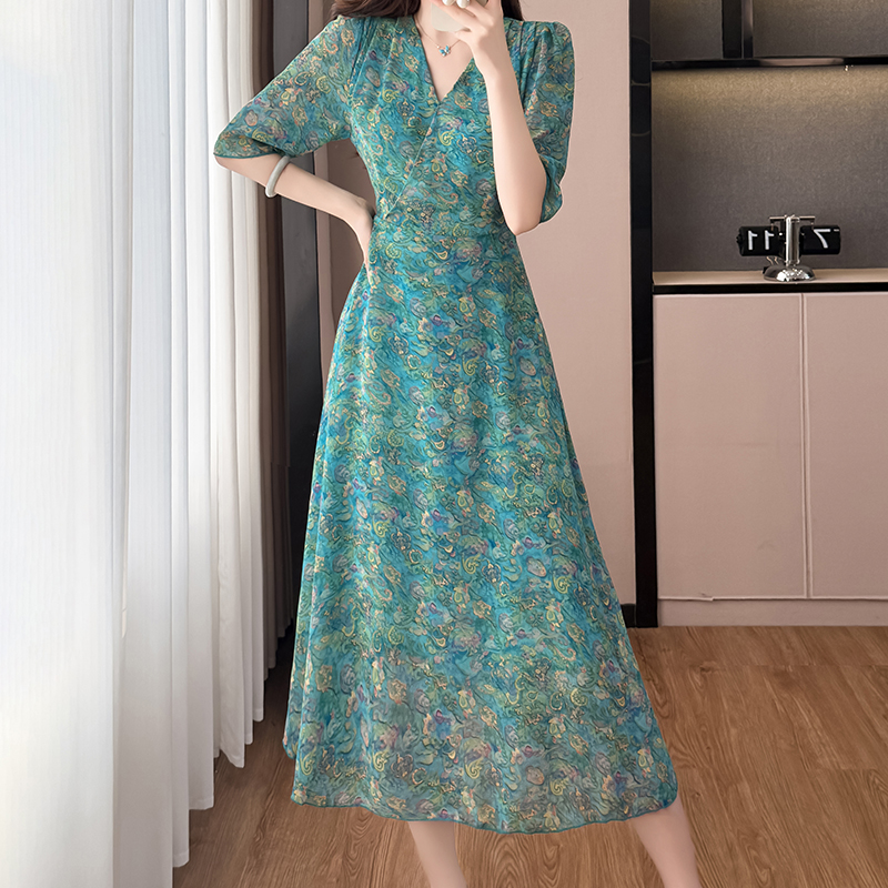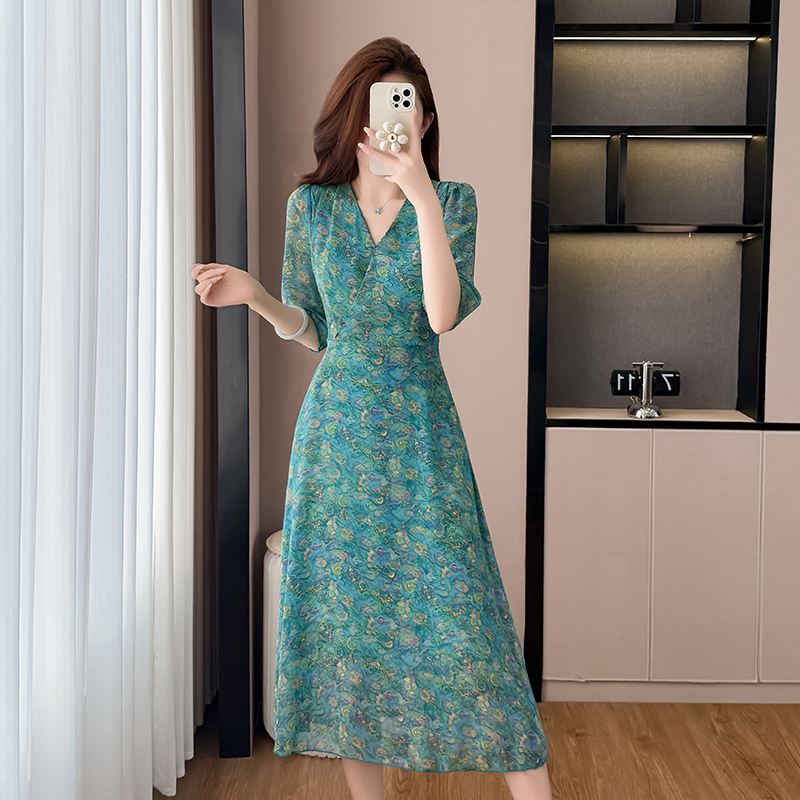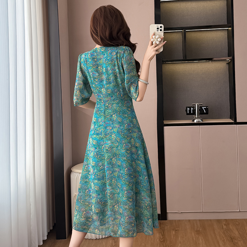 BY17295# 雪纺碎花时尚洋气修身显瘦中长款阔太太装短袖连衣裙夏季新款