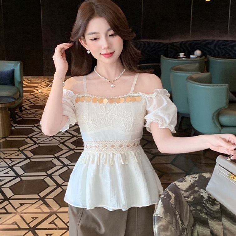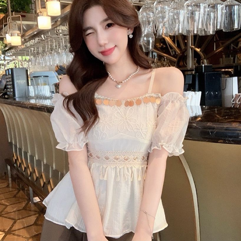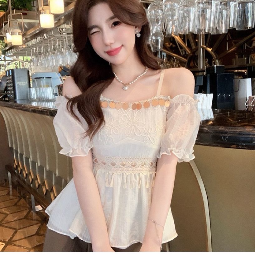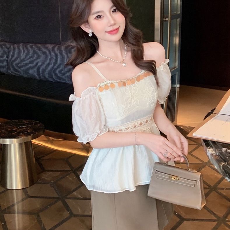 BY17302# 夏季新款设计感收腰纯欲性感露肩上衣法式一字肩泡泡袖雪纺衬衫女