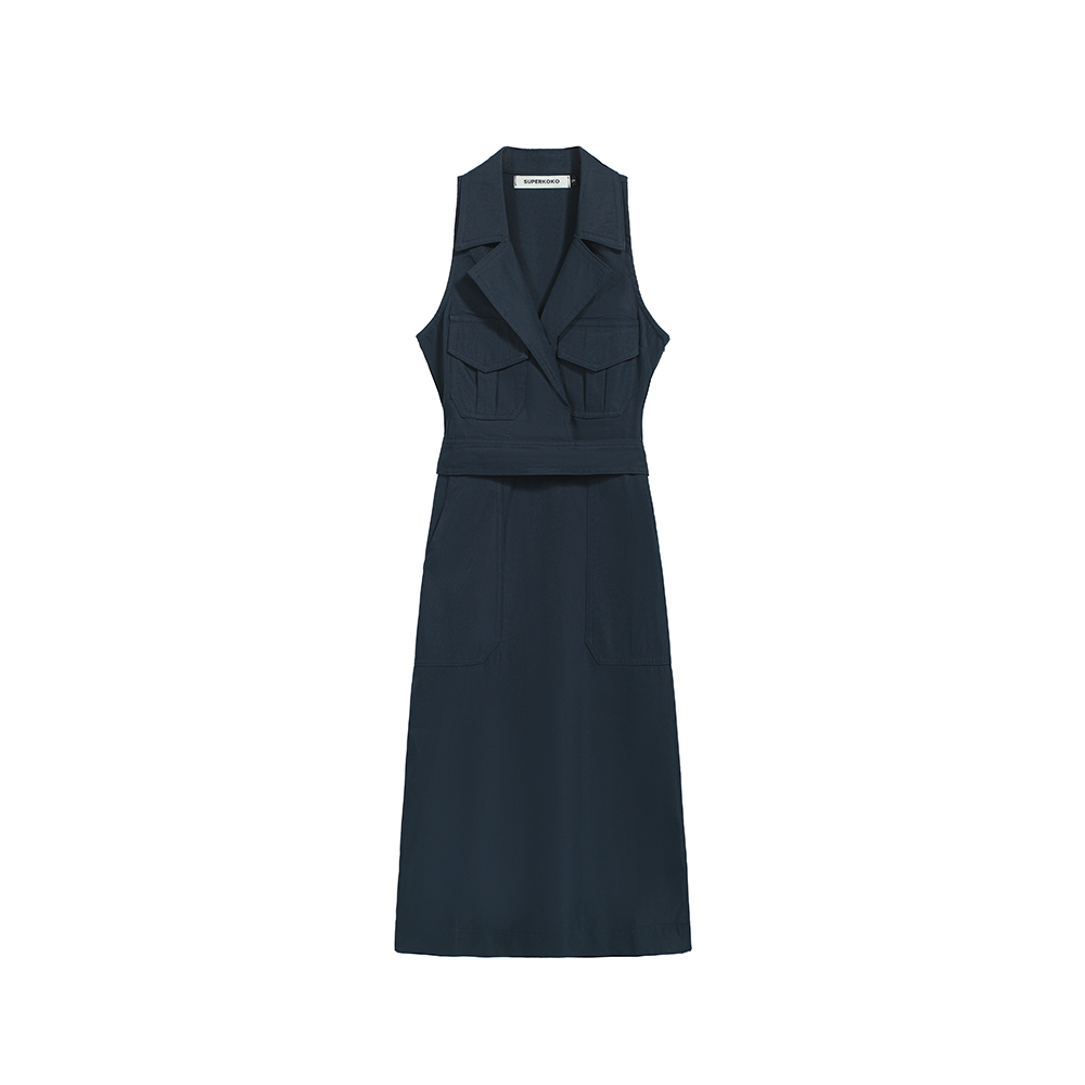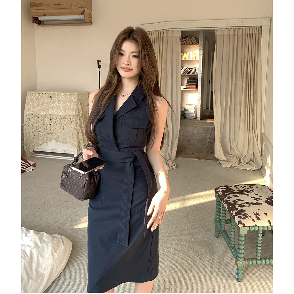 BY17329# 春夏新款法式无袖连衣裙女长裙气质v领绑带收腰显瘦裙子