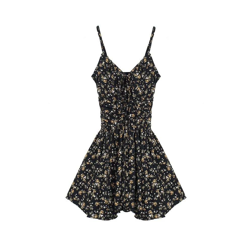 BY17330# 春夏装新款设计感黑色碎花连衣裙女茶歇短裙辣妹吊带裙