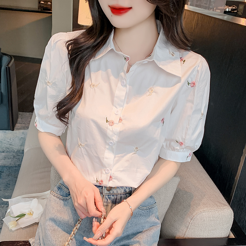 BY17352# 新款泡泡袖刺绣衬衣小清新短袖上衣衬衫女