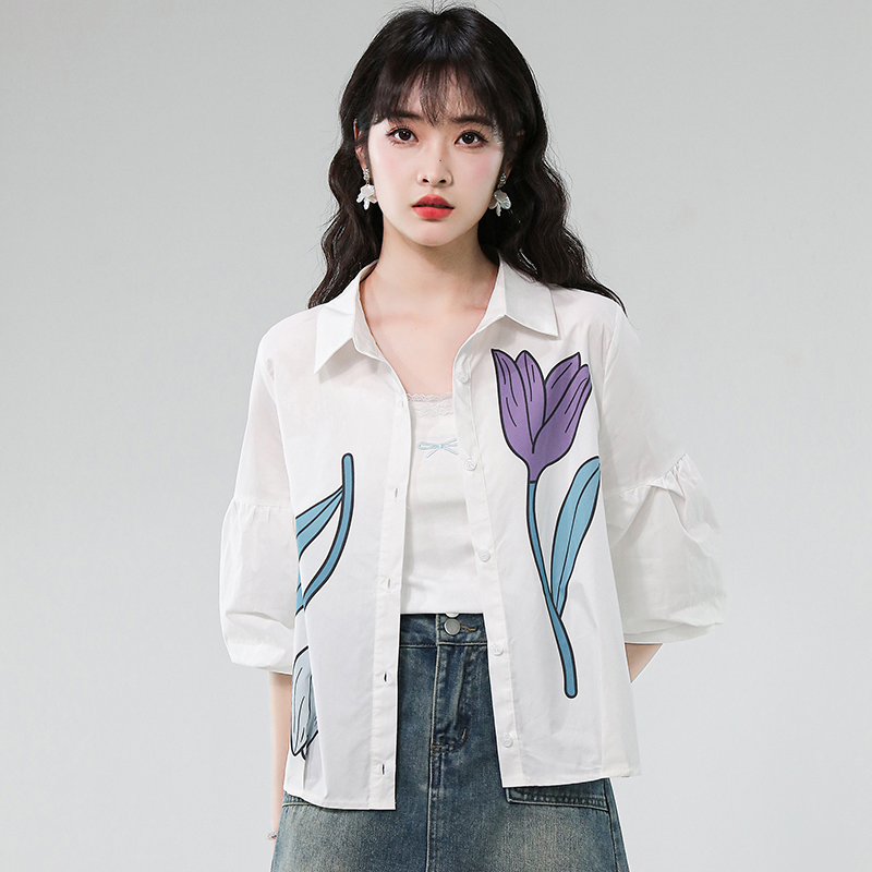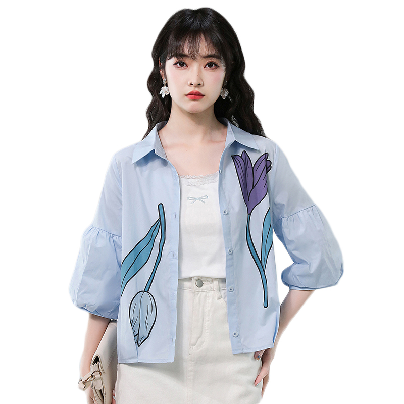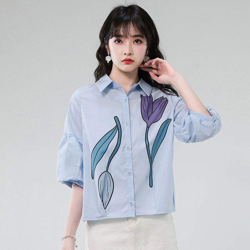 BY17357# 夏季新款时尚气质翻领印花灯笼袖衬衫女宽松显瘦百搭上衣
