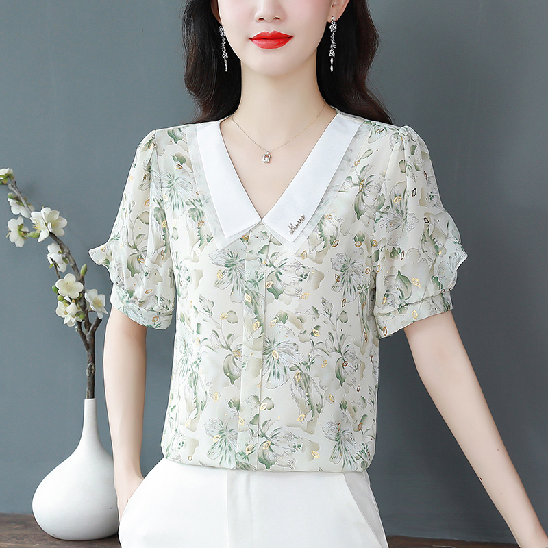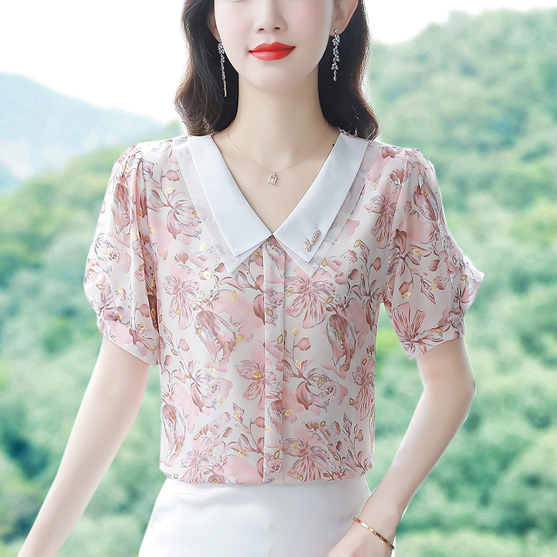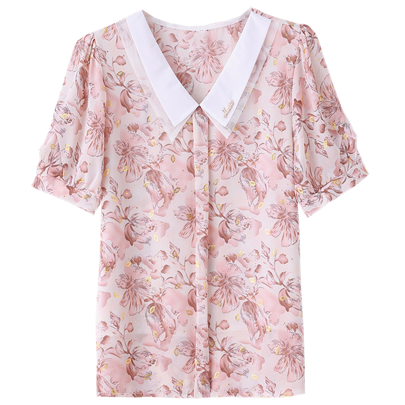 BY17366# 夏季碎花娃娃领减龄雪纺衫女洋气遮肚显瘦短袖上衣