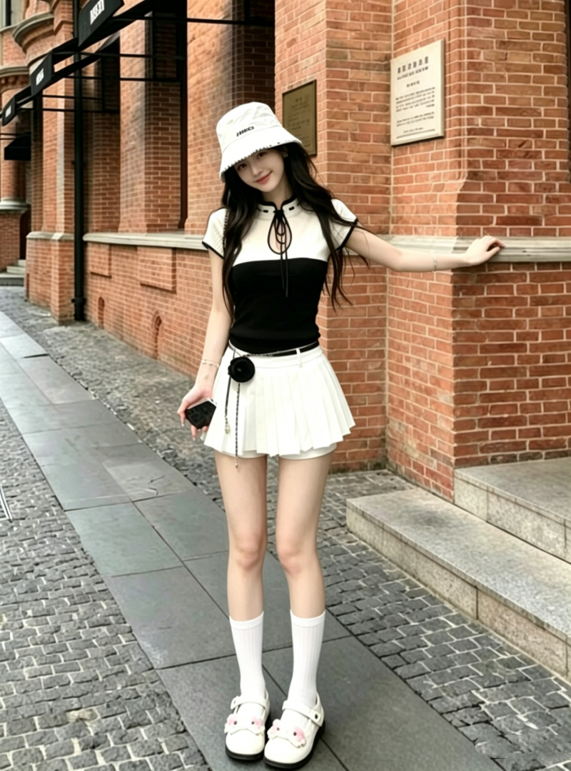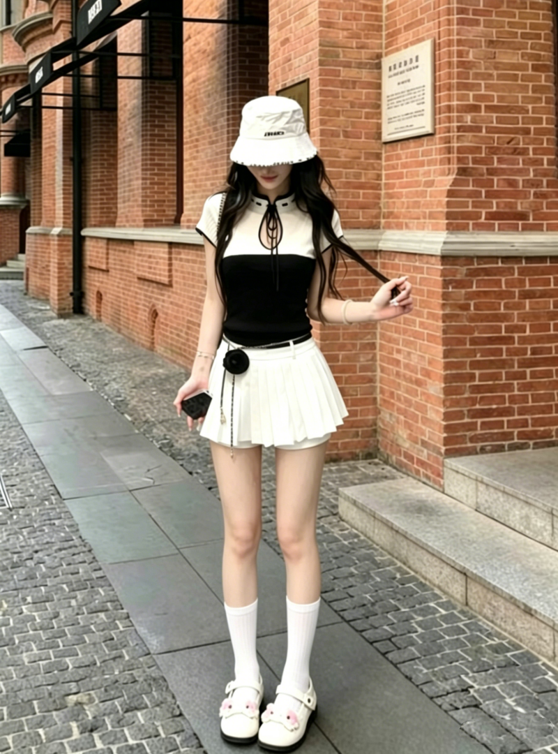 Home > 韩版套装 > 纯欲辣妹半高领系带镂空短袖针织衫搭白色半身百褶裙一整套 服裝批發女裝批發服飾貨源