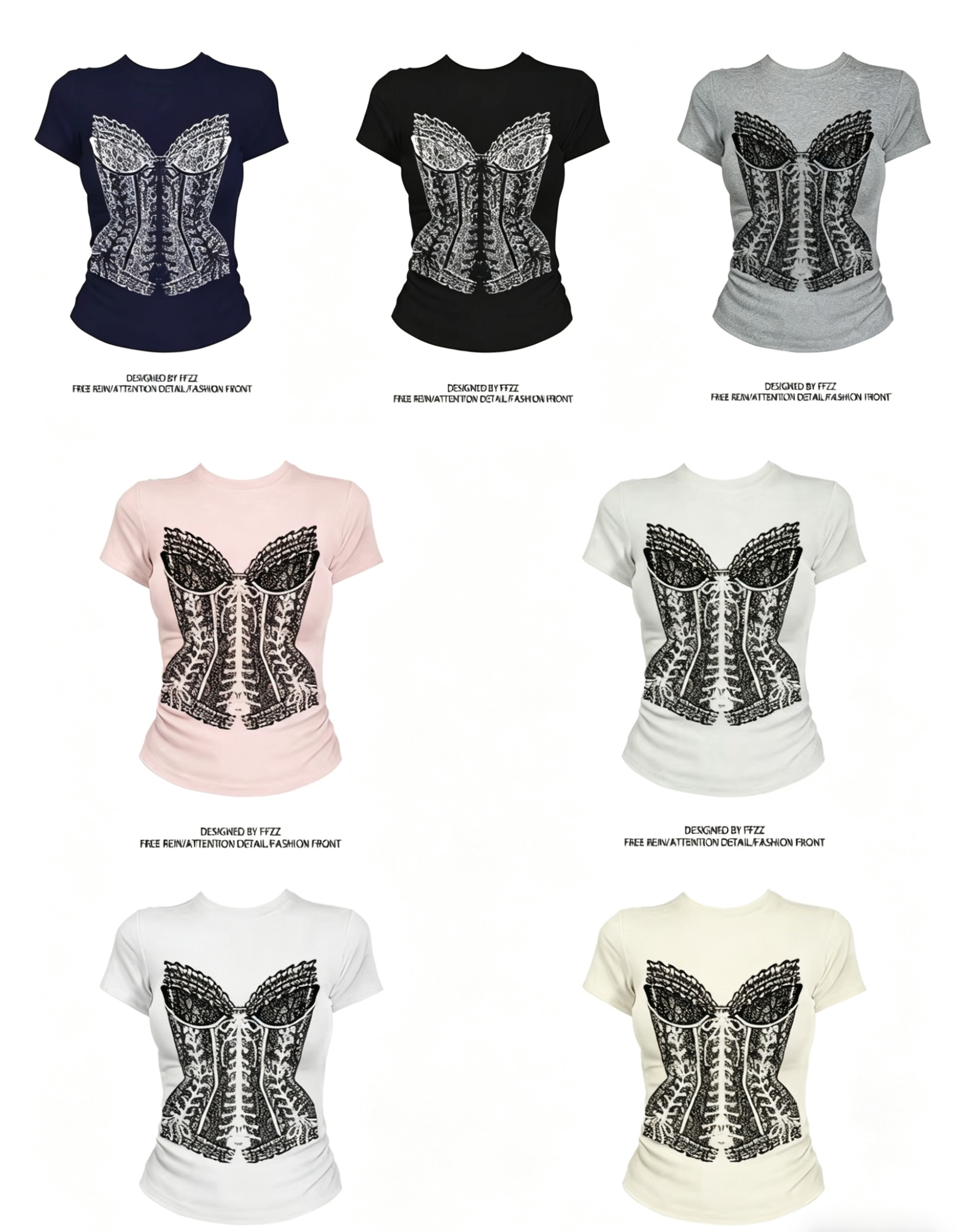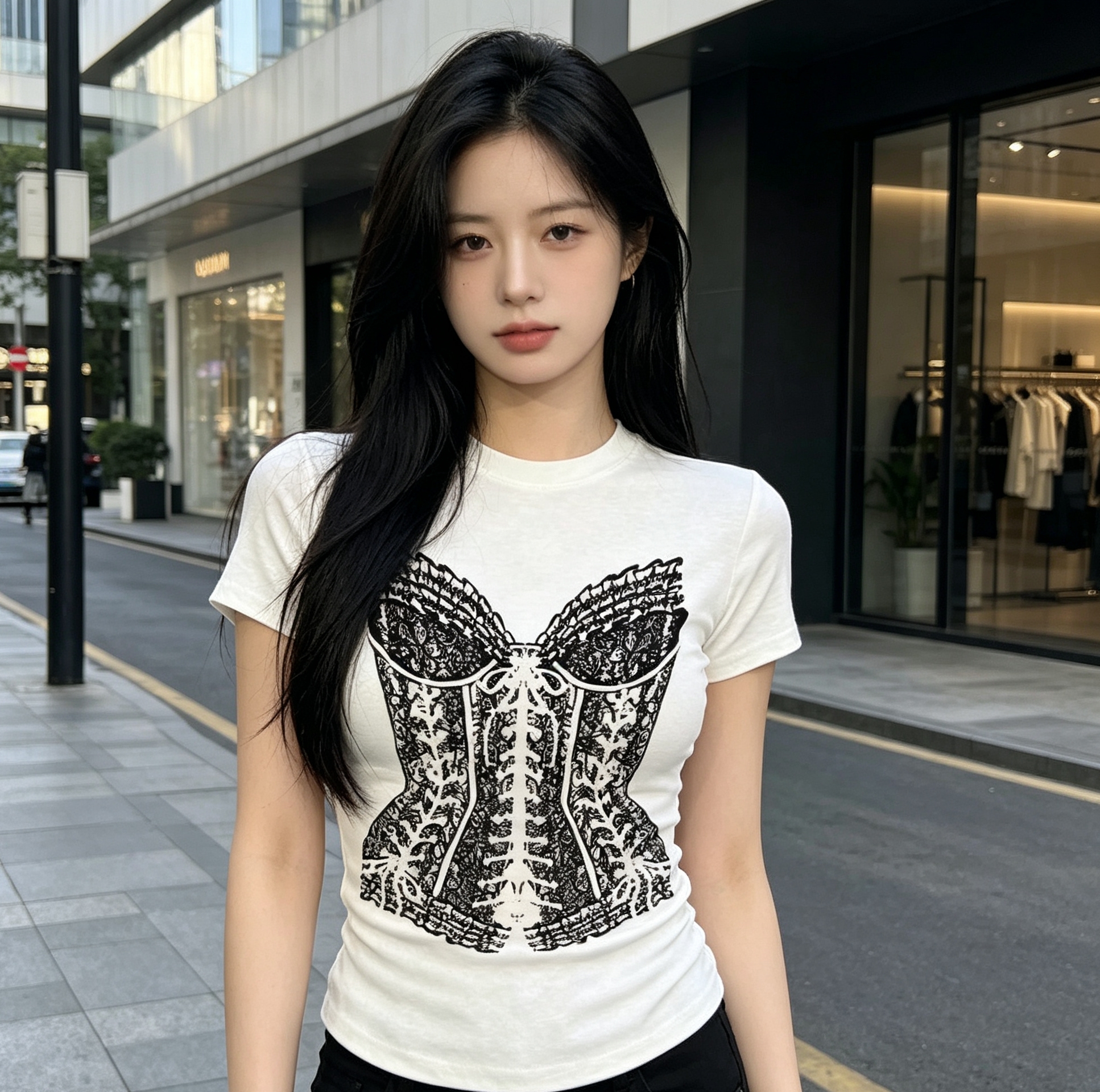 韩版灰色印花短袖T恤女夏修身设计感小众洋气减龄高级感别致上衣 服裝批發女裝批發服飾貨源
