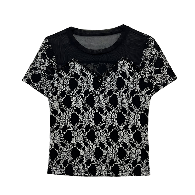 春夏圆领手工钉珠网纱拼接短袖t恤女时尚修身时髦打底衫潮 服裝批發女裝批發服飾貨源