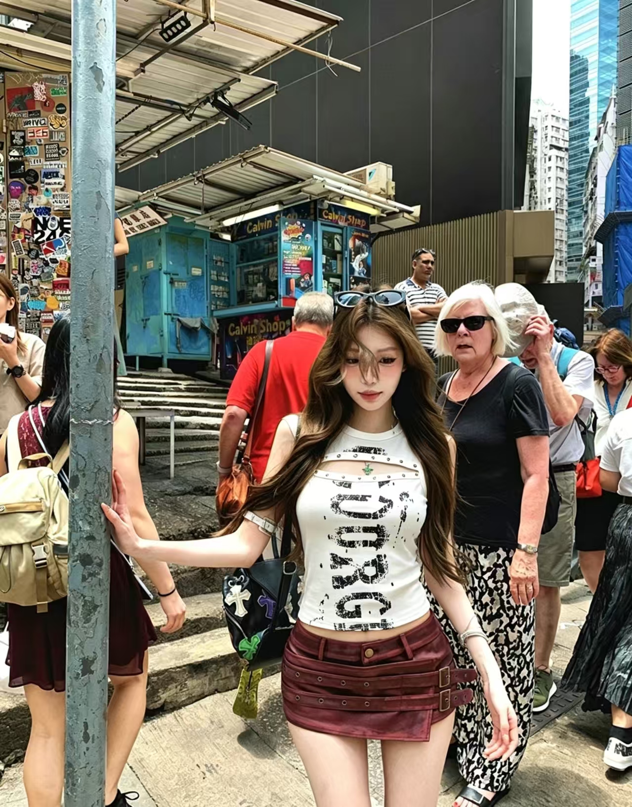 野性夏日美式辣妹胸前镂空印花背心女夏季修身显瘦短款无袖上衣 服裝批發女裝批發服飾貨源
