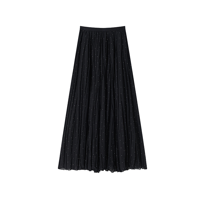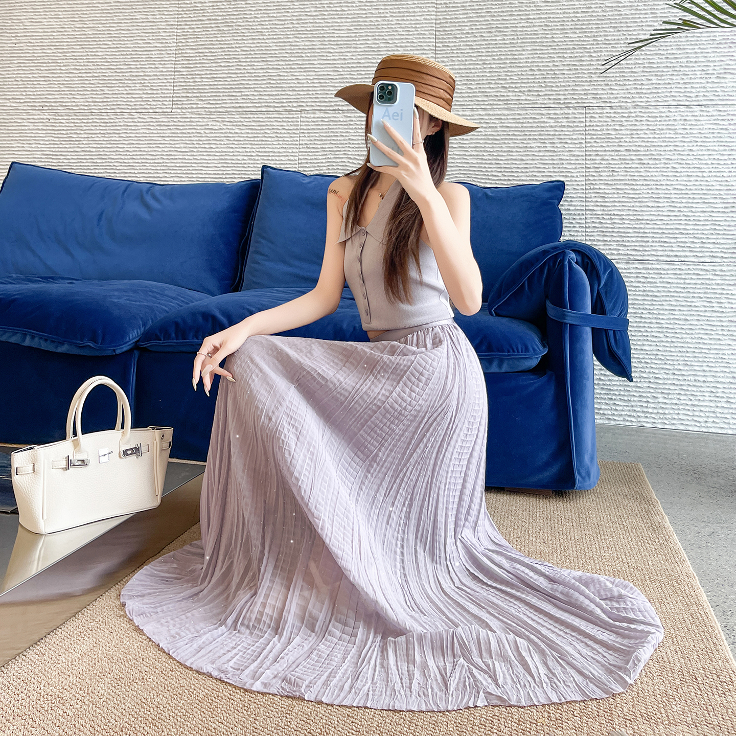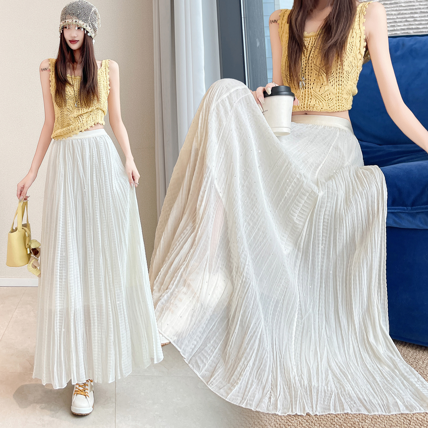 雪纺烫钻褶皱网纱半身裙女夏薄款高腰A字垂坠感中长款温柔蛋糕裙 服裝批發女裝批發服飾貨源