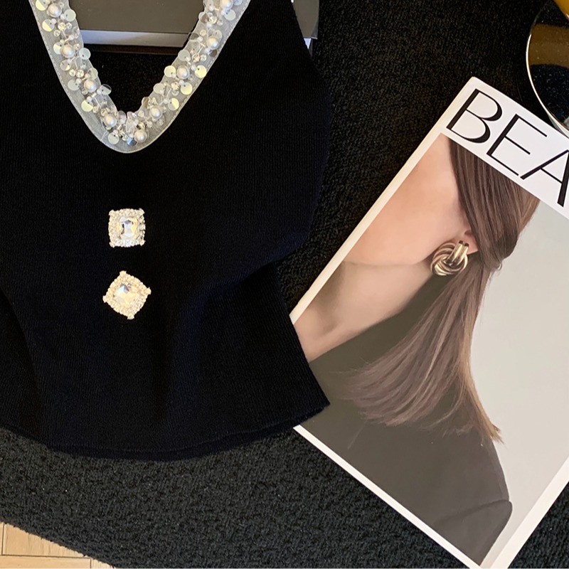 BY17936# 新款镶钻露背针织挂脖吊带小背心女修身辣妹短款上衣女带胸垫 服裝批發女裝批發服飾貨源