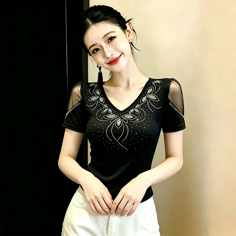 BY18759# V领烫钻短袖T恤女夏季新款网纱露肩设计感小众修身上衣 服裝批發女裝批發服飾貨源