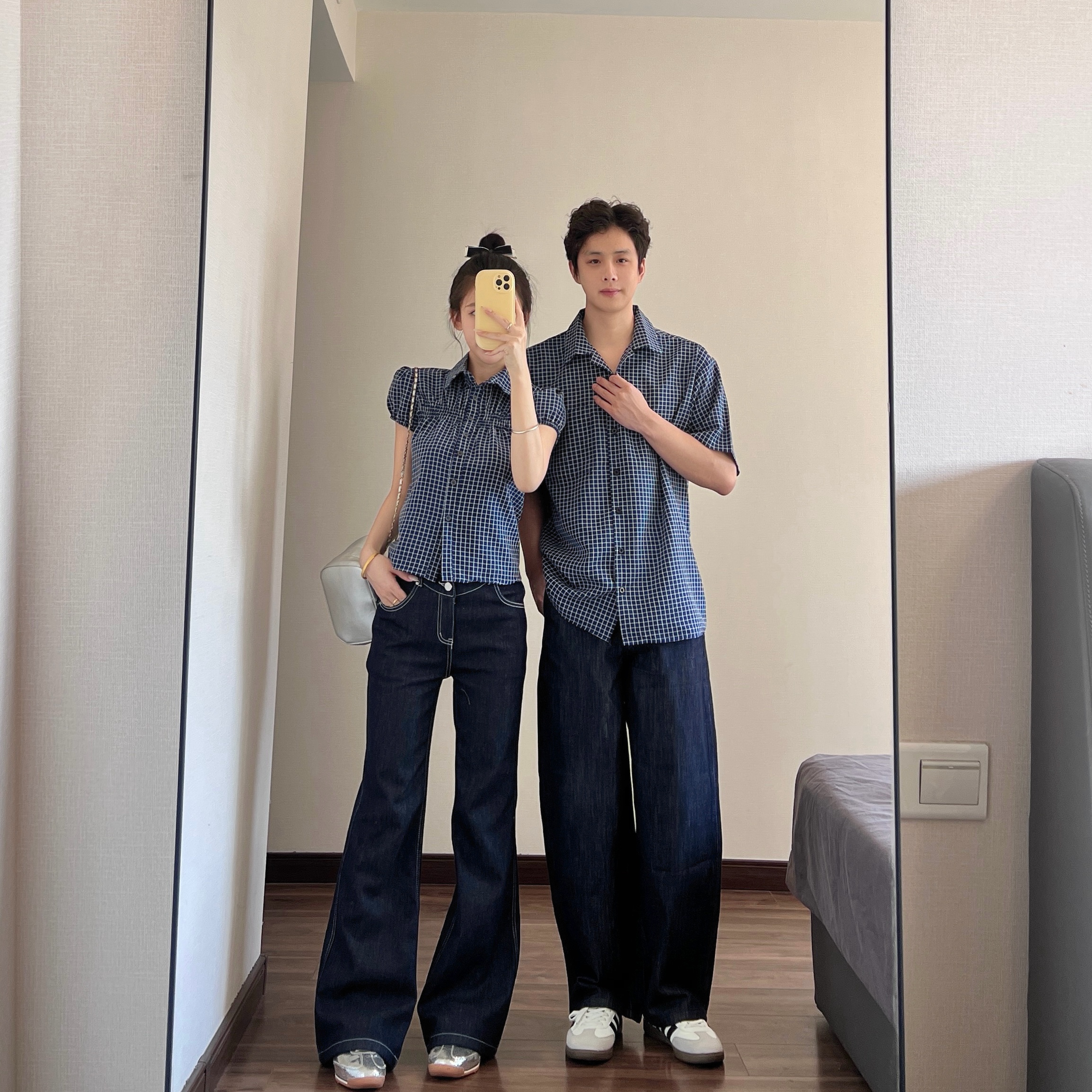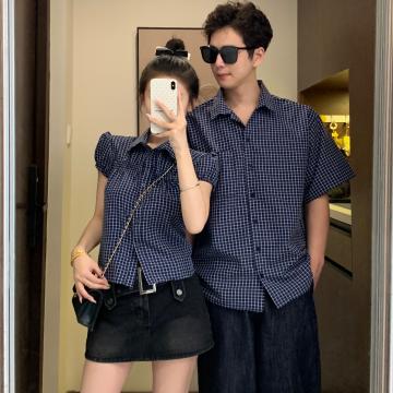BY19031# 情侣装夏季设计感韩系复古蓝色格纹泡泡袖衬衫 服裝批發女裝批發服飾貨源