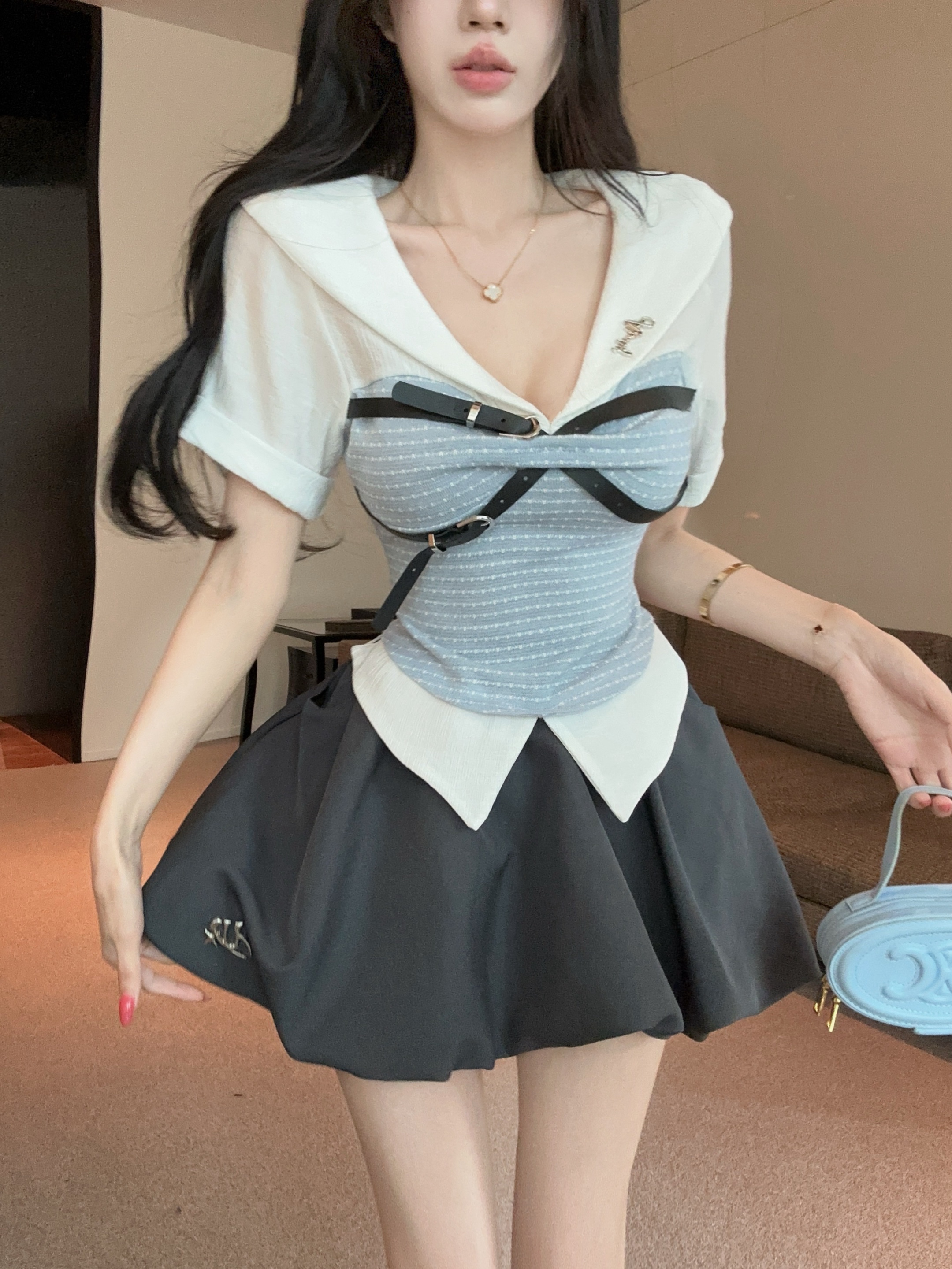 BY19140# 夏季设计感学院风甜美假两件拼接上衣+花苞半身裙套装女 服裝批發女裝批發服飾貨源