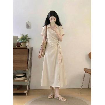 BY19159# 大码法式气质白杏色短袖衬衫连衣裙女夏季polo长裙 服裝批發女裝批發服飾貨源