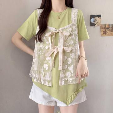 BY19161# 大码宽松时髦叠穿蕾丝马甲t恤两件套短袖上衣女夏季新款 服裝批發女裝批發服飾貨源