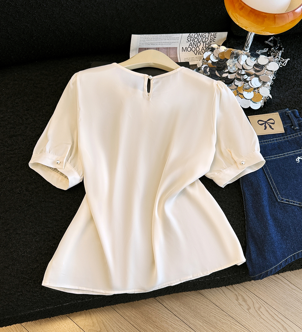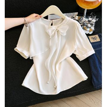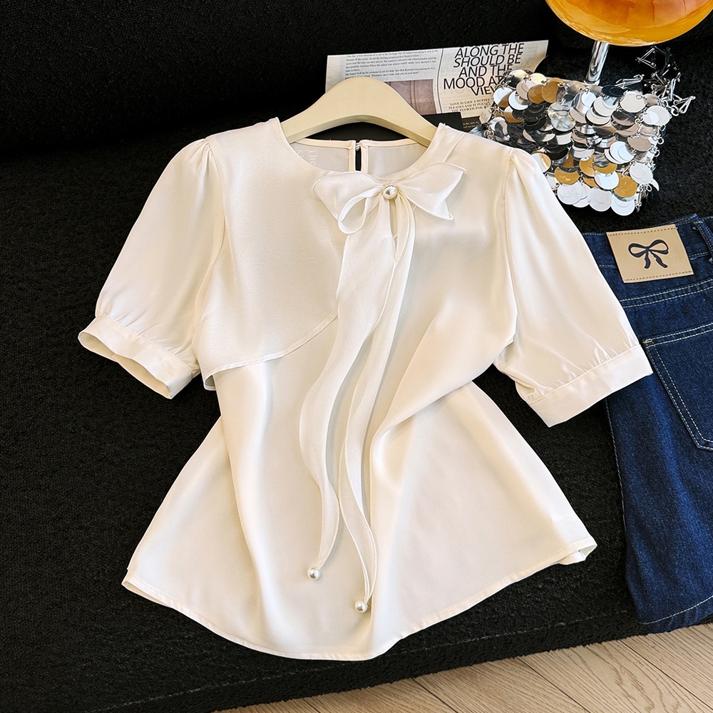 BY19163# 夏季新款短袖缎面蝴蝶结钉珠衬衫女上衣夏小衫 服裝批發女裝批發服飾貨源