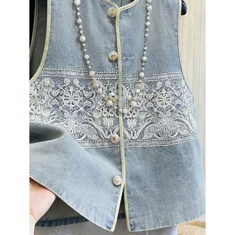 BY19193# 夏新中式国风牛仔设计马甲女圆领类似拼接减龄百搭通勤外套 服裝批發女裝批發服飾貨源