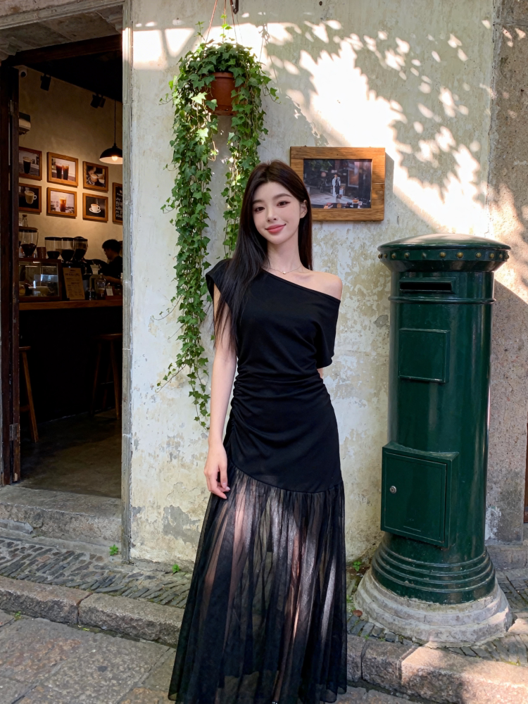 BY19201# 法式高级感斜领网纱裙子女夏季新款时尚精致修身显瘦连衣裙 服裝批發女裝批發服飾貨源