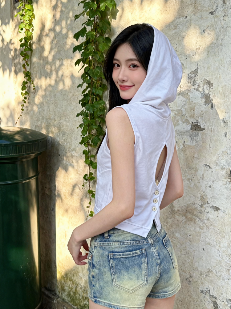 BY19202# 纯欲气质风镂空纽扣连帽无袖T恤夏季新款时髦修身短款上衣 服裝批發女裝批發服飾貨源