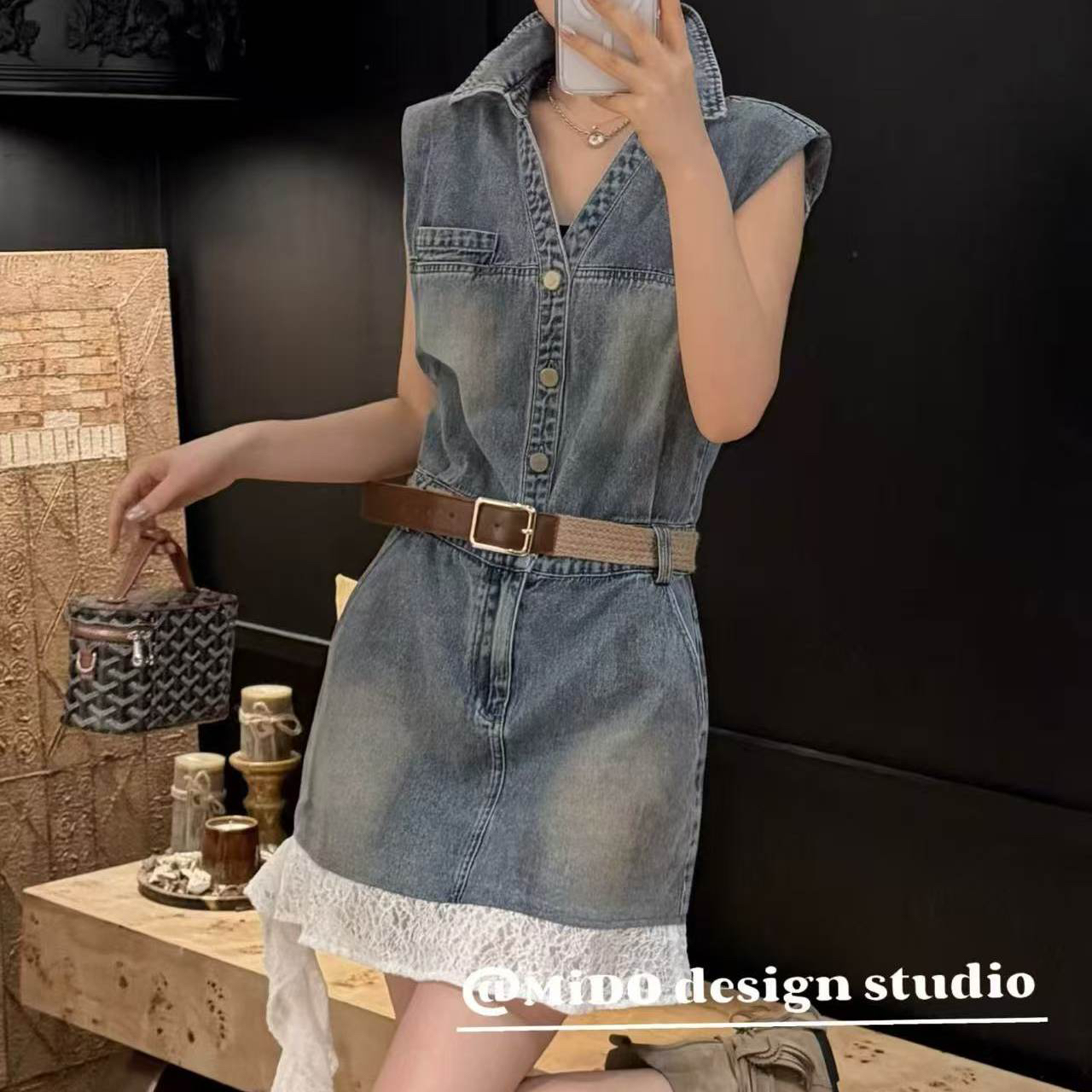 BY19205# 欧洲站夏季新款V领单排扣小众设计感拼蕾丝边牛仔连衣裙无袖 服裝批發女裝批發服飾貨源