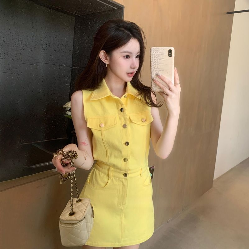BY19206# 法式复古黄色牛仔连衣裙夏季新款气质简约无袖polo领连衣裙 服裝批發女裝批發服飾貨源