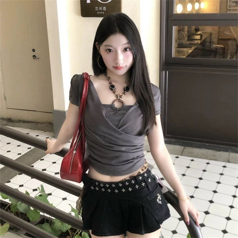 BY19208# 纯欲辣妹风串珠挂脖短袖T恤女夏季新款修身设计感短上衣 服裝批發女裝批發服飾貨源