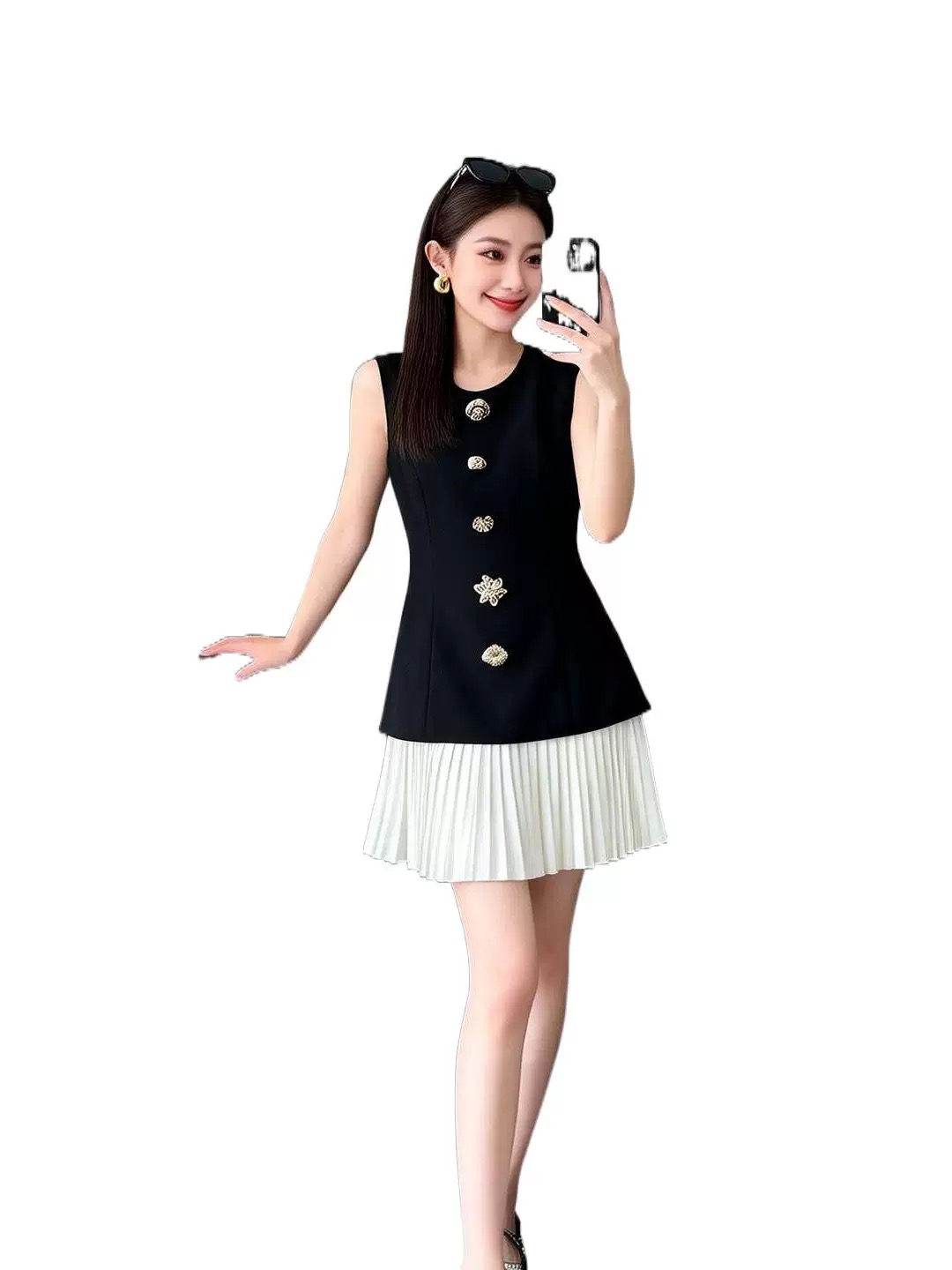 FA56889# 小香风名媛小黑裙短裙圆领撞色假两件背心裙拼接百褶无袖连衣裙子