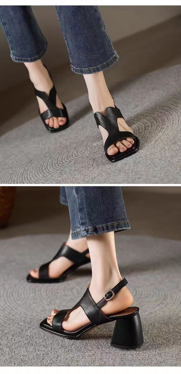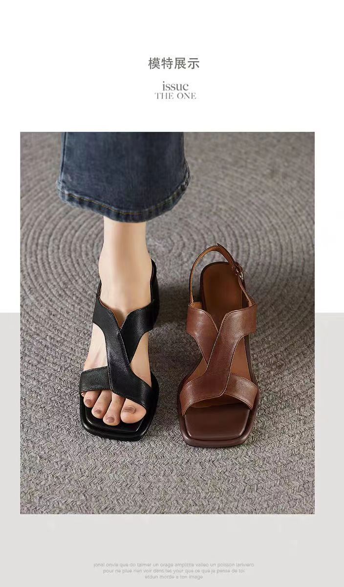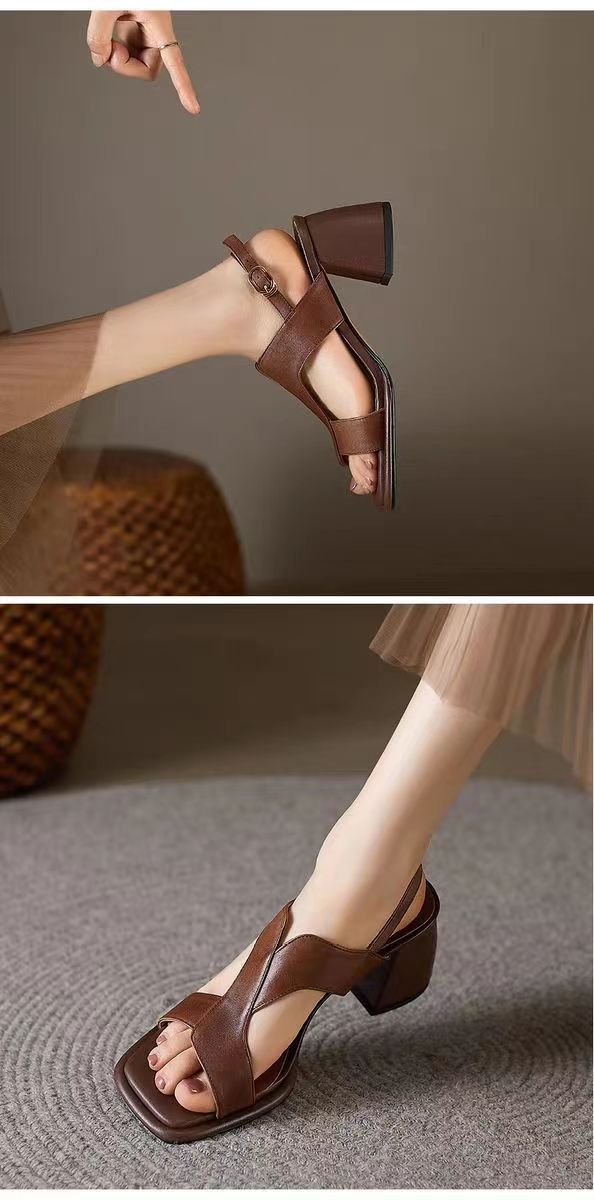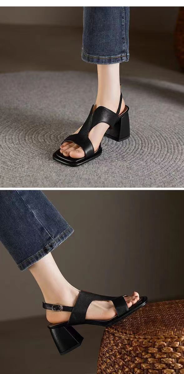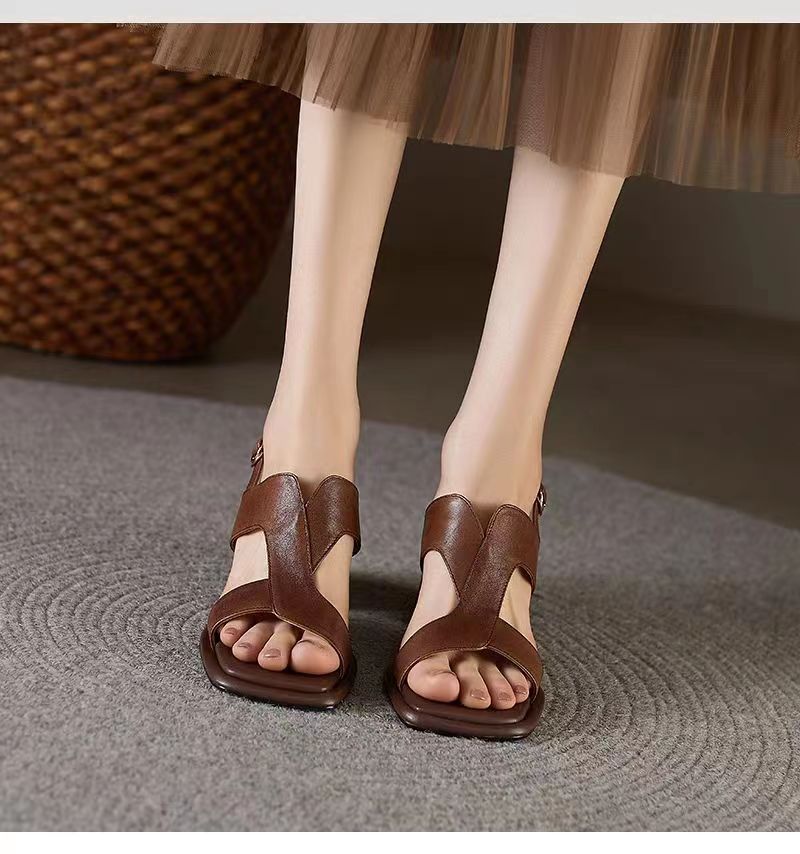 X-32751# 夏新款凉鞋女复古轻熟风时尚简约百搭粗跟一字扣带真皮高跟鞋