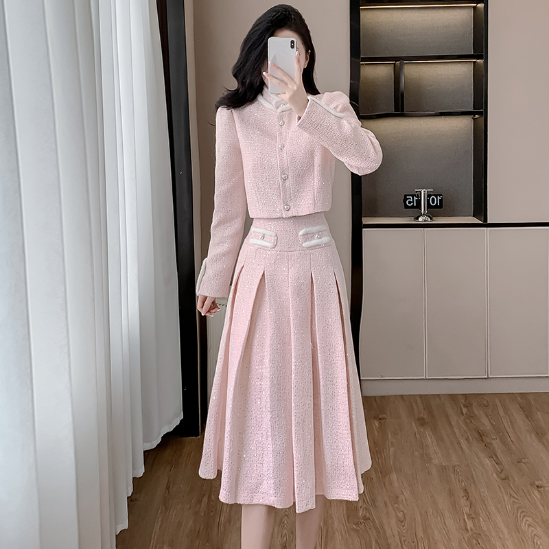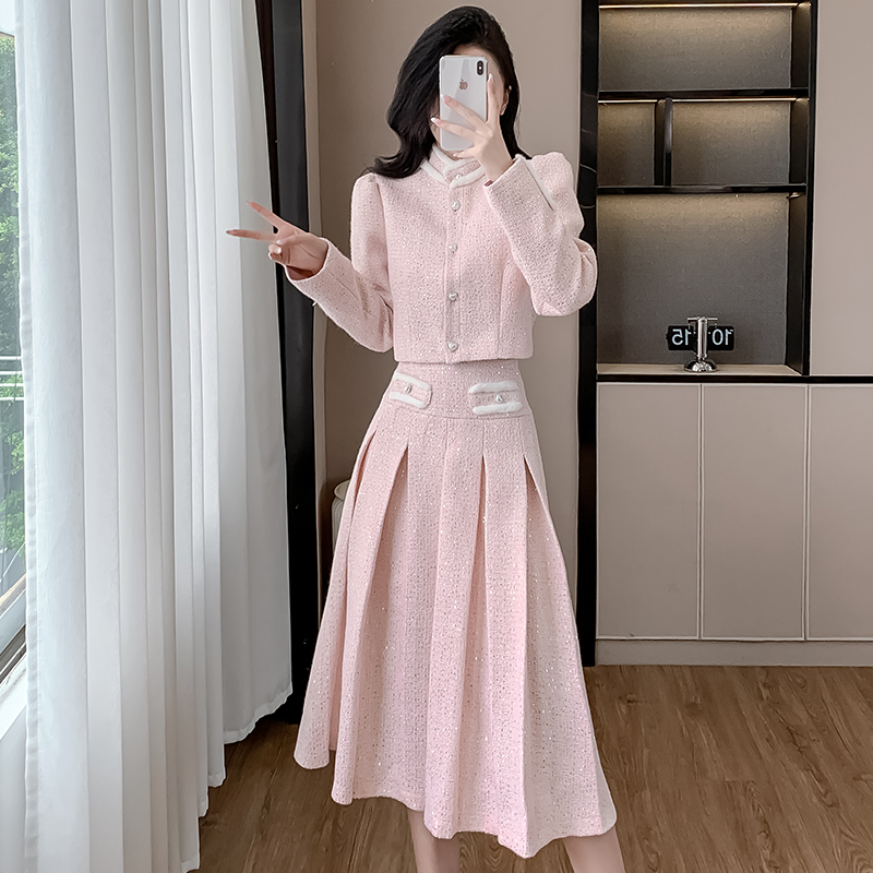 FA43018# 秋冬新款LazyDidi桃花醉复古小香风外套加百褶长裙两件套装 服裝批發女裝批發服飾貨源