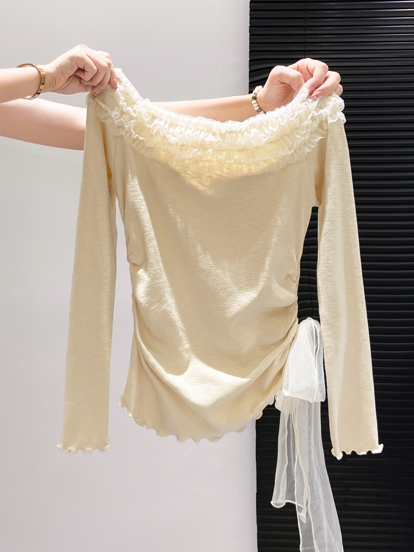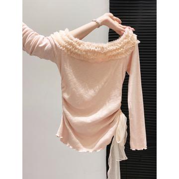 FA43286# 法式甜美粉色蕾丝边一字领长袖t恤女早秋新款收腰显瘦短上衣 服裝批發女裝批發服飾貨源