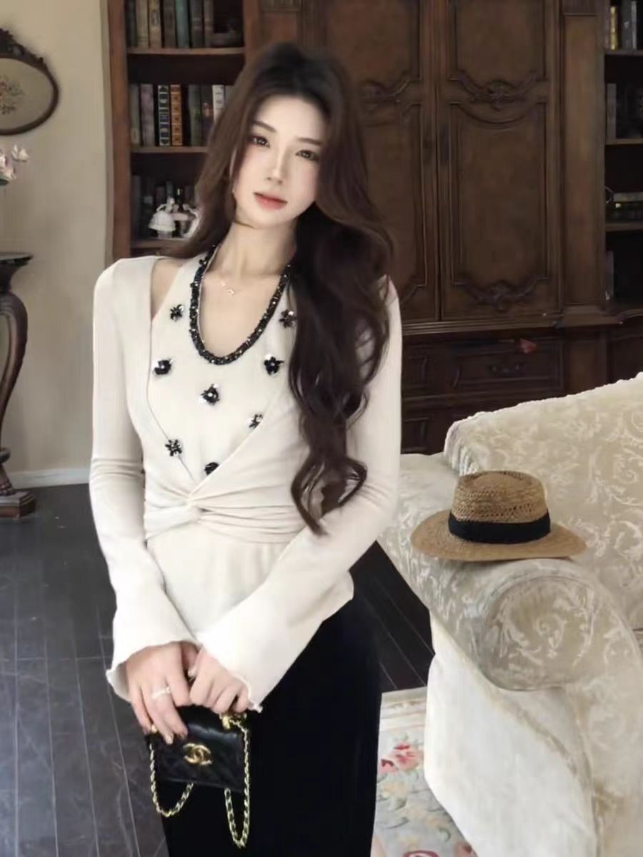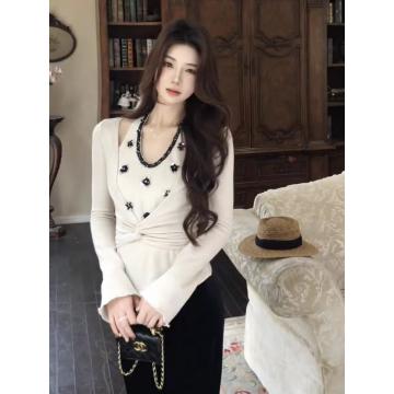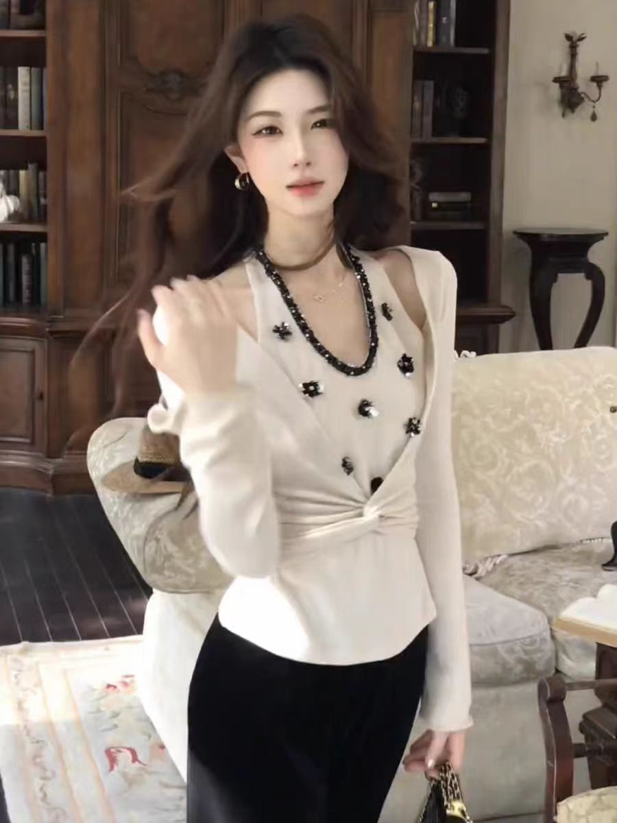 FA43301# 法式设计感镶钻露肩假两件针织衫女秋季新款洋气扭结挂脖上衣 服裝批發女裝批發服飾貨源