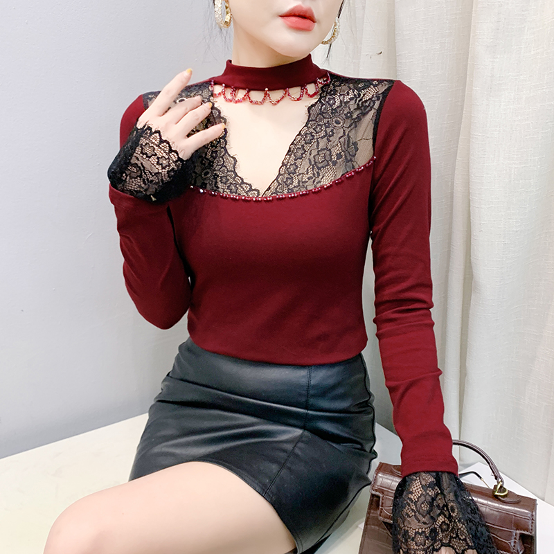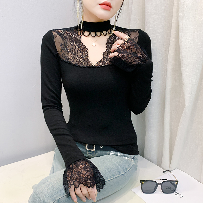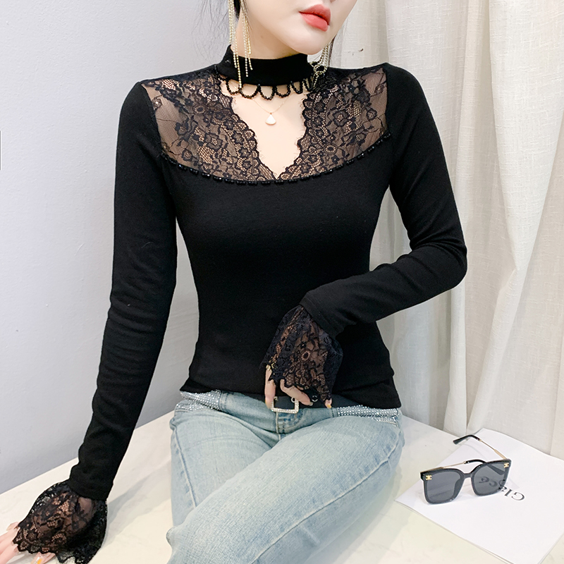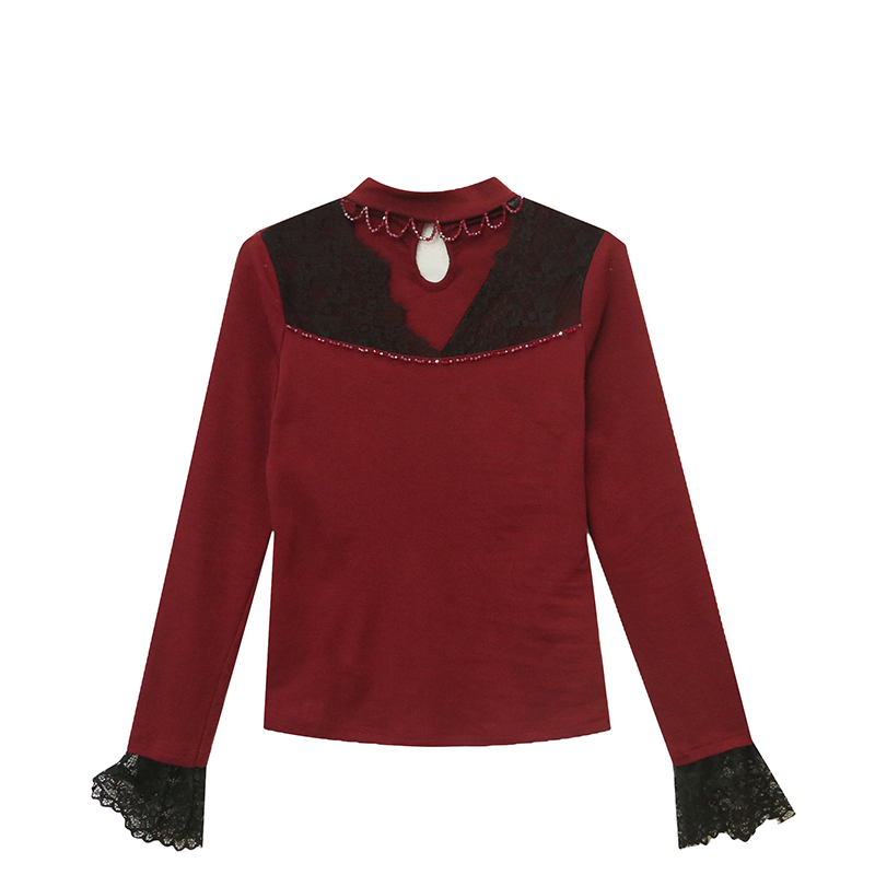 首页 > 长袖T恤 > FA43494# 设计感磨毛打底衫冬新款蕾丝拼接钉珠镂空法式气质小衫女 服裝批發女裝批發服飾貨源