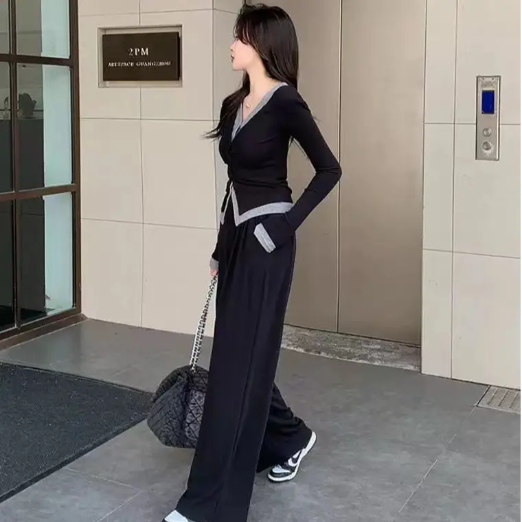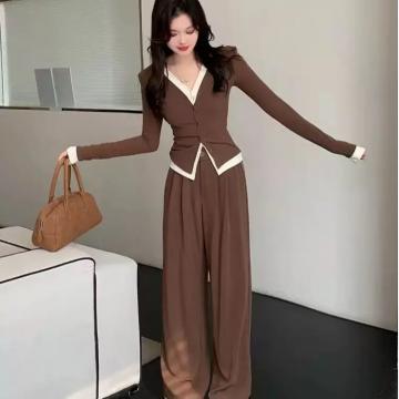 FA43625# 秋季休闲时尚假两件设计显瘦上衣+高腰显瘦阔腿裤两件套套装 服裝批發女裝批發服飾貨源
